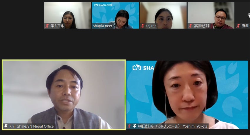 イベント当日は日本とネパールをつなぎ、東京事務所・事業推進グループの横田職員とネパール事務所・防災事業担当のキル職員の2人がお話ししました。横田職員からはネパールの災害における気候変動の影響やシャプラニールの防災活動について、キル職員からは現地からの目線で行政や地域住民との関わり方、NGOの支援の意義や難しさについて話しました。