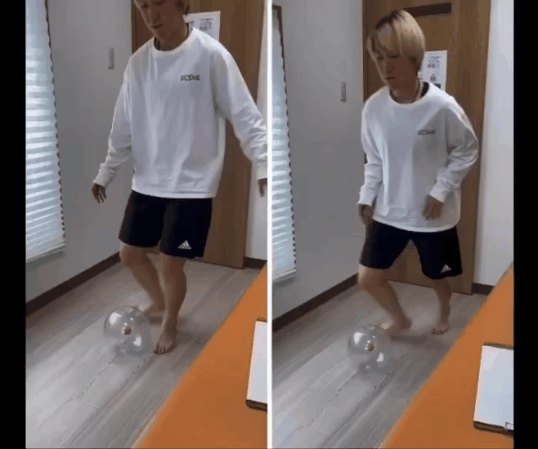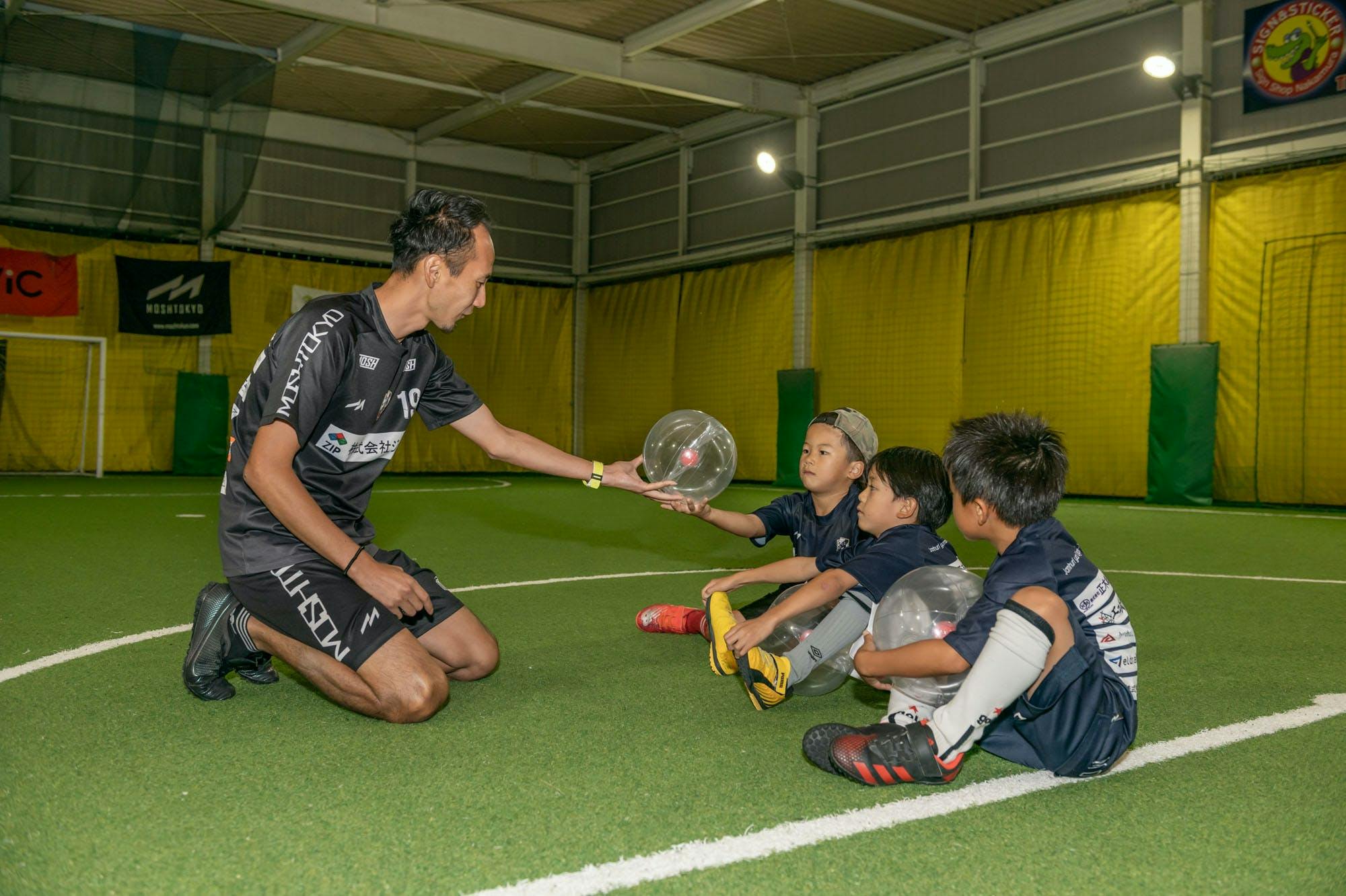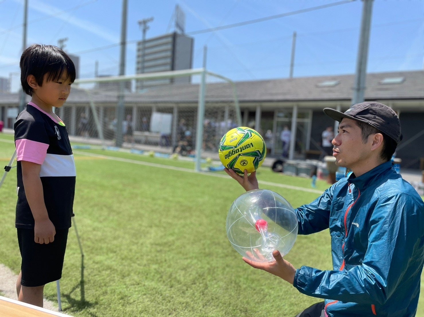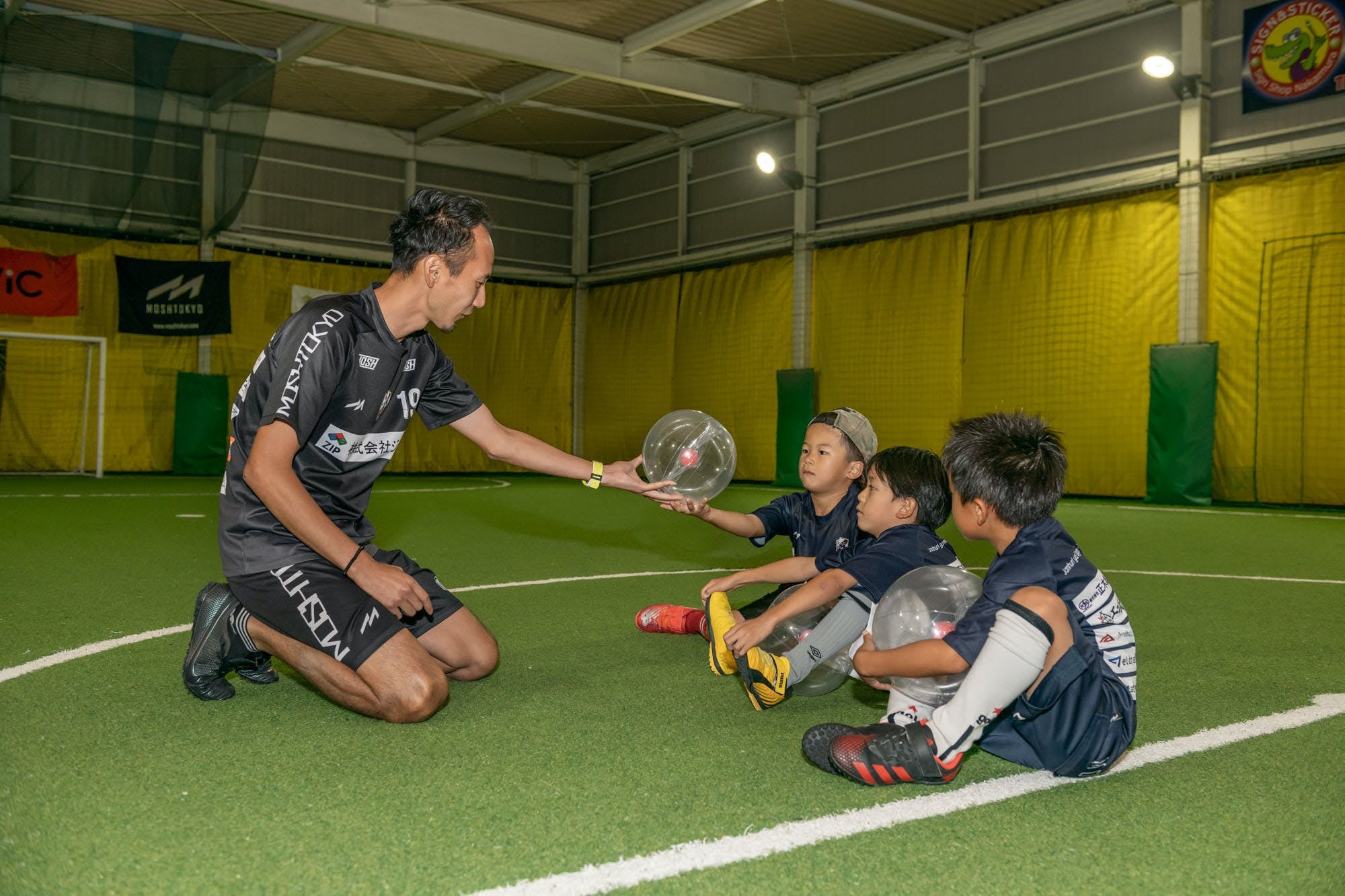 このボールを活用して、色々なインパクトや色々なドリブル、色々なトラップをしてみて、重心に対してどういう力が加わることでボールがどのようにふるまうかを、視覚的にも感覚的にも身につけてほしいと思います。」