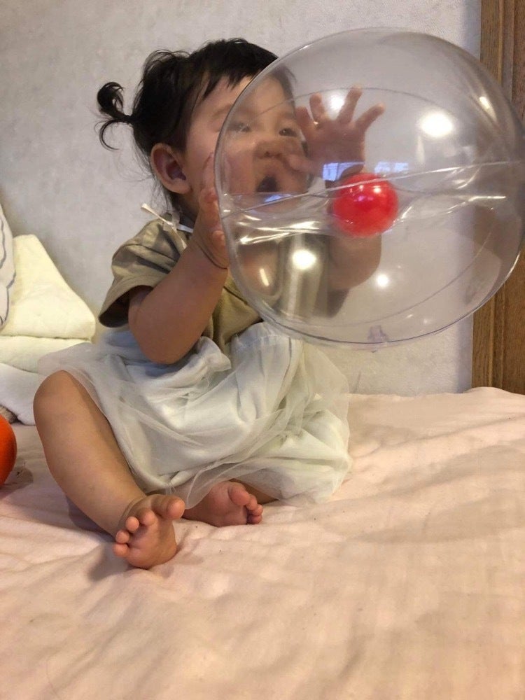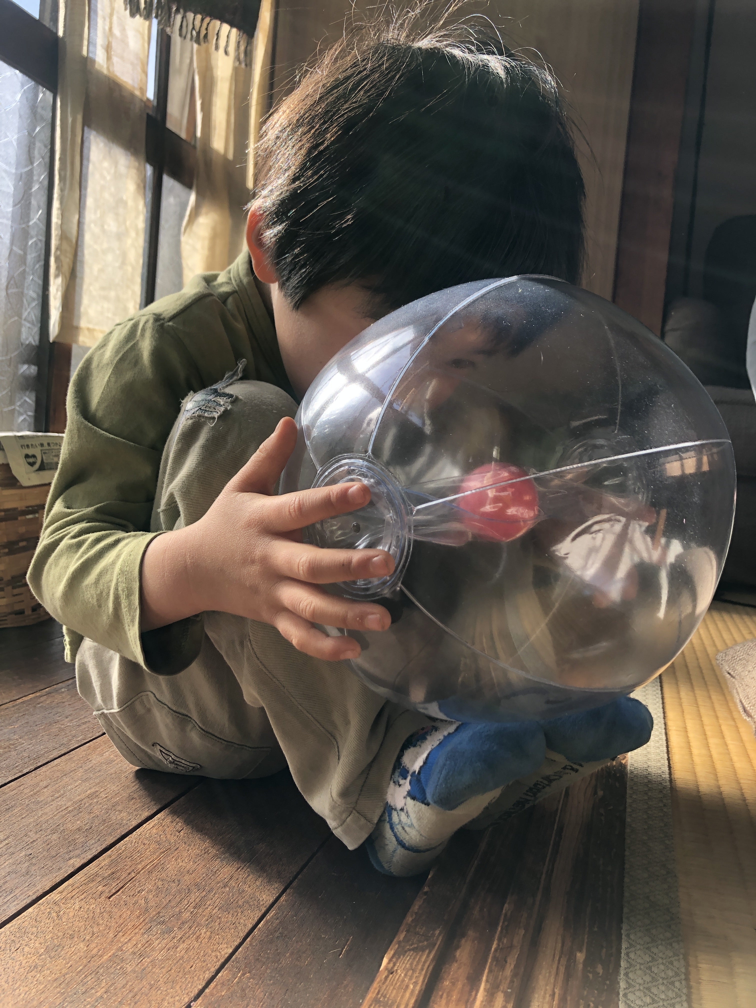 僕が子どもの頃にあったらどれだけ嬉しかったかな!とワクワクしながら葛山さんからボールを初めて見せていただいた時に感じました。それから3歳と2歳になる娘たちにこのボールを使って遊ばせるといろんな気づきがありました。ビーチボールを投げると怖がるのに同じ大きさのヒノマールは全然怖がりませんでした。透明で中心に小さな赤いボールが入っているだけなので、迫ってくる感覚もないみたいで、子ども達のボール遊びにも最適でした!