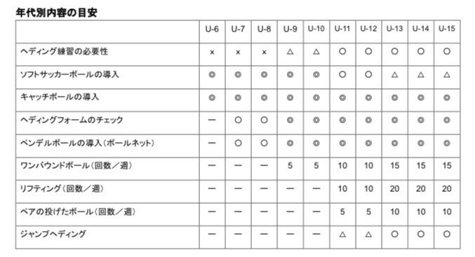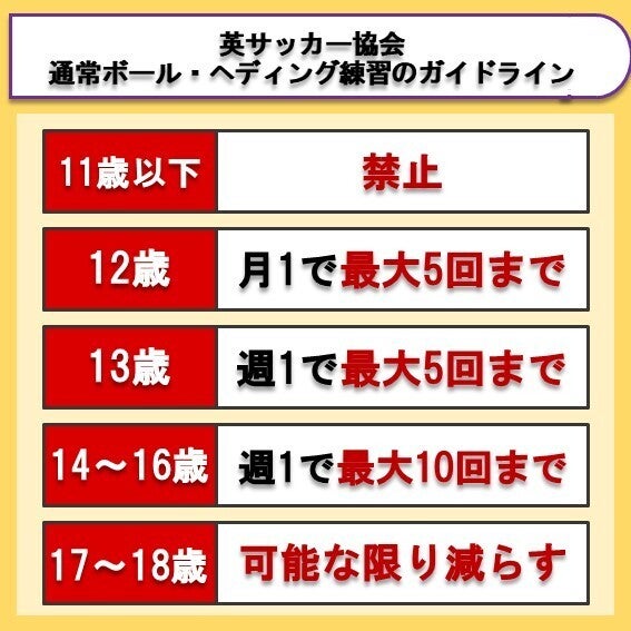 11歳以上でも年齢ごとにヘディング練習の制限を設け、プロのイングランド・プレミアリーグでも強力なヘディングの練習回数を週10回に制限しています。