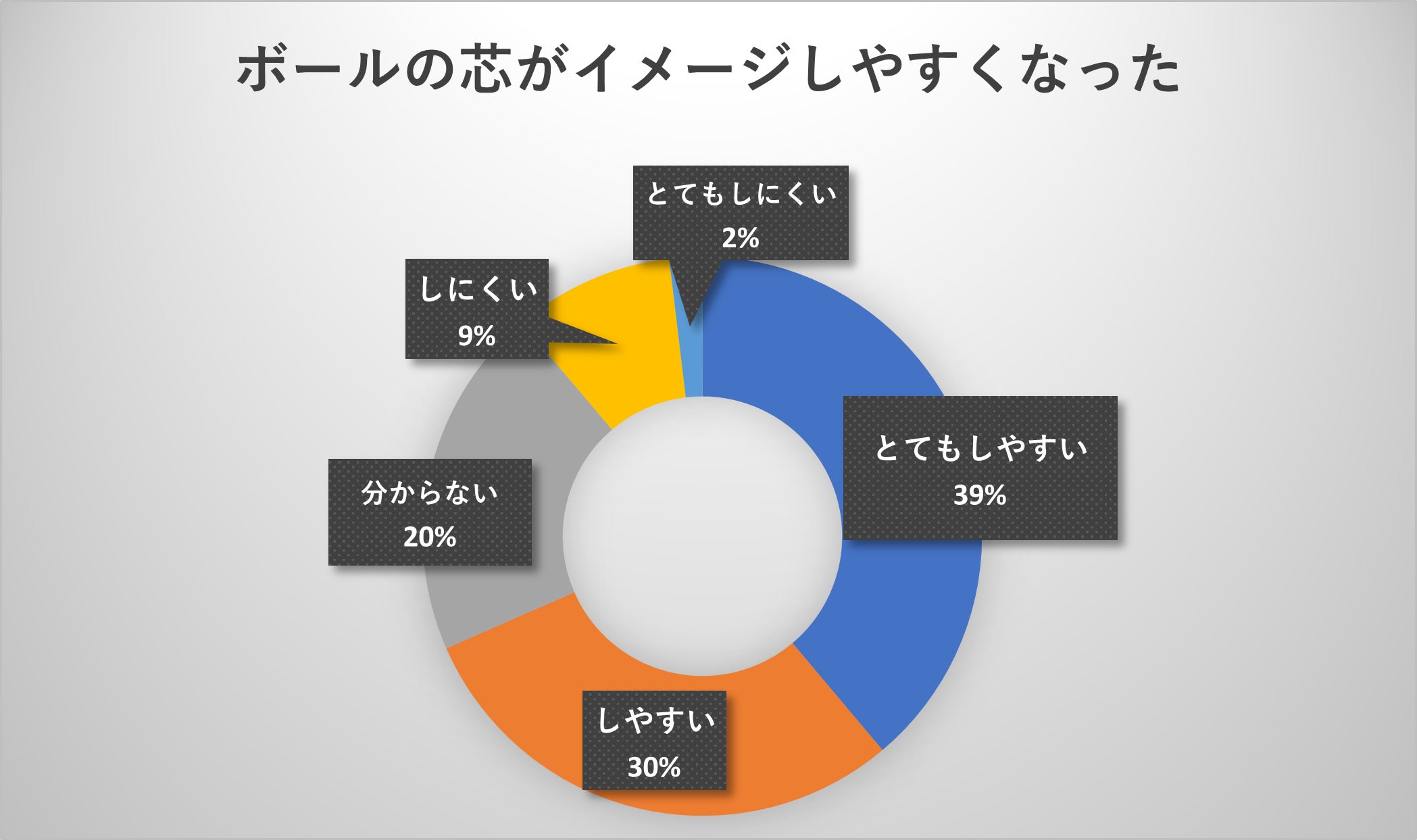 サッカー経験のある54名(6歳~16歳)の方にヒノマールを使用してもらったところ、68.5%(37名)の方がボールの芯を「とても捉えやすくなった/捉えやすくなった」と回答しています。