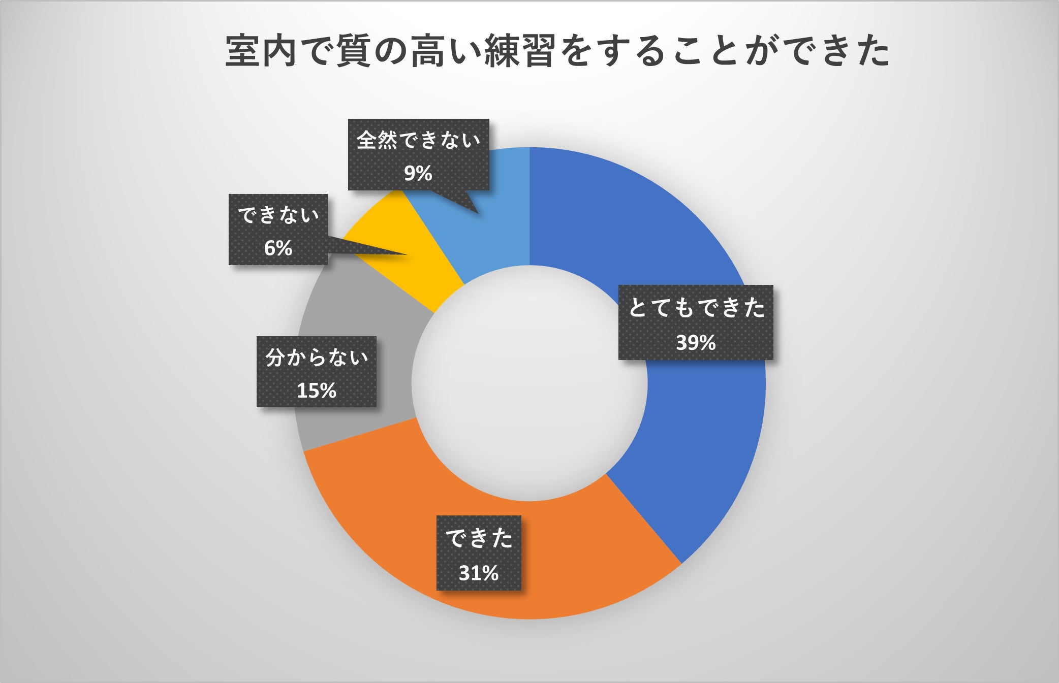 サッカー経験のある54名(6歳~16歳)の方にヒノマールを使用してもらったところ、70.4%(38名)の方が室内練習の質が「とても向上した/向上した」と回答しています。