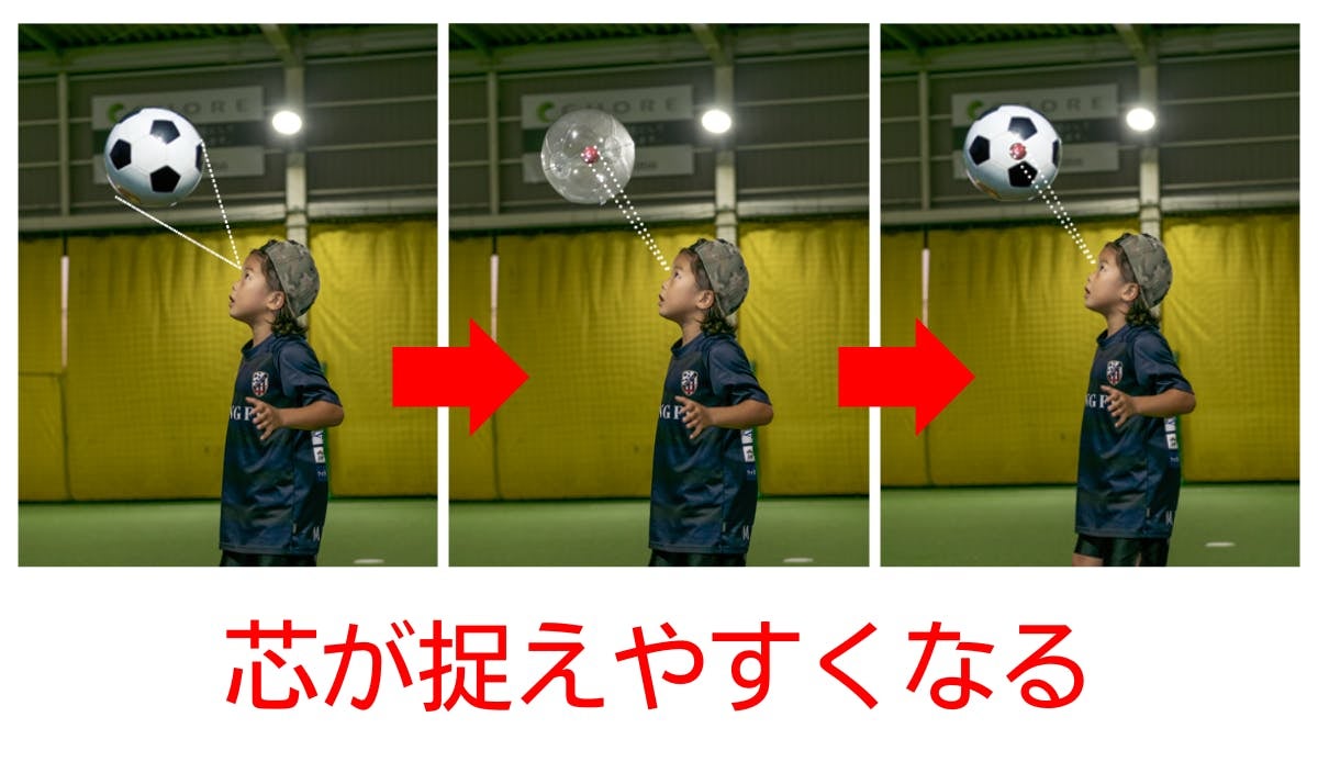 ボールコントロール技術を高めるために重要なことは「ボールの芯を捉えられるようになること」ですが、従来のボールでは芯を見ることができません。世界に名だたる超一流のコーチでさえも「ボールの芯・重心の位置」を子ども達に、分かりやすく指導する事は困難です。だから、子ども達は感覚で芯を捉えることを身につける以外に方法は有りませんでした。