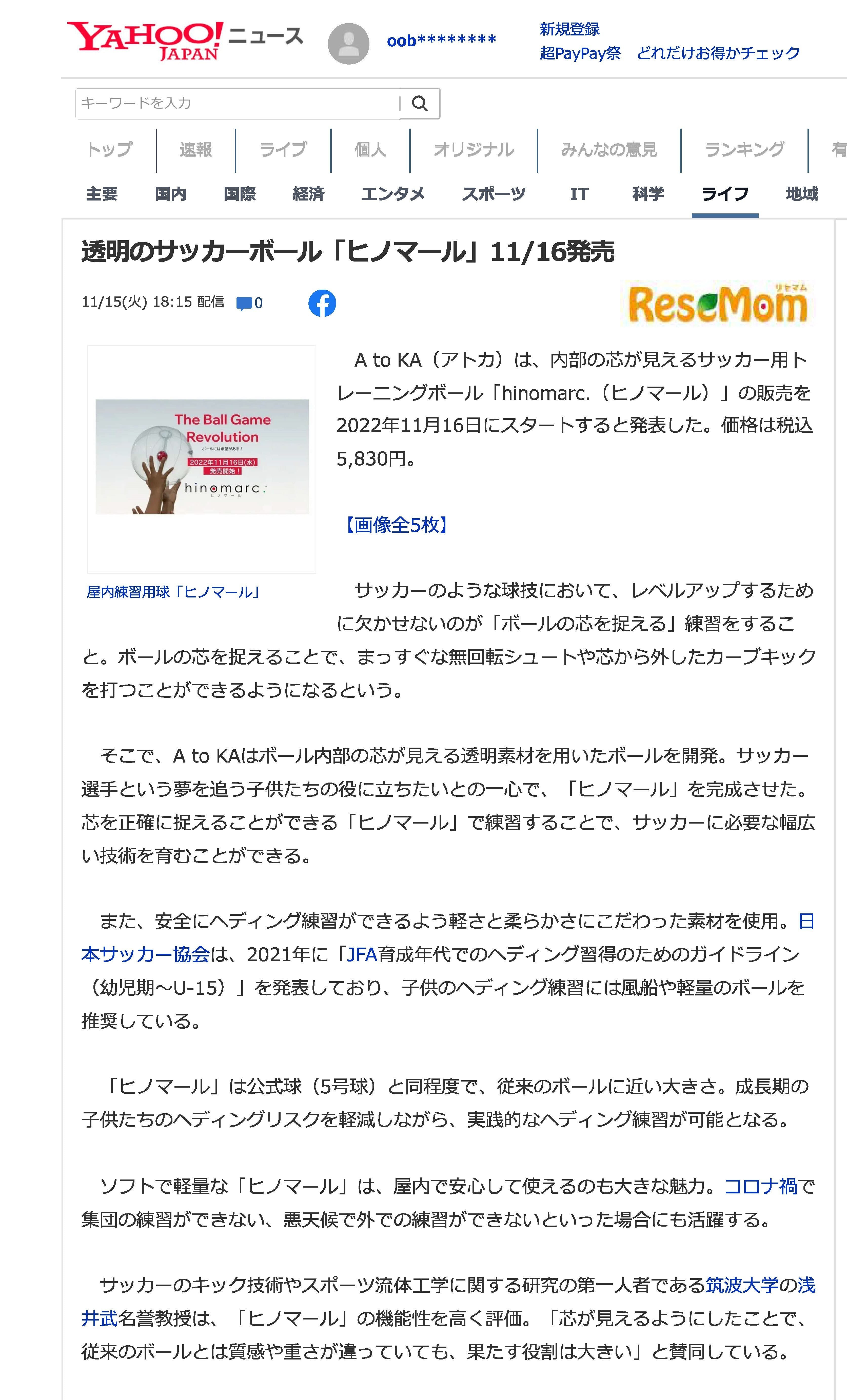2023/12/20 16:27皆さまの温かいご支援のお陰で「クラウドファンディングアワード2023」TOP100にノミネートされました。CAMPFIREクラウドファンディングアワードとは クラウドファンディング「CAMPFIRE(キャンプファイヤー)」にて約1年間に実施されたプロジェクトの中から、「CAMPFIREが大事にしたいクラウドファンディング」を10つのタイトルとして表現し、ノミネートされたプロジェクトに対して表彰するコンテストです。選考フロー 第1次審査(2023年11月下旬) 約10,000件を超えるプロジェクトの中から運営事務局が10つのタイトルを元に100プロジェクトを選出。ヒノマールは 「発明で驚きをあたえた」カテゴリーにて栄えある選出をいただきました。皆さまからの温かいご支援のお陰です。ありがとうございました!!! 皆さまからの一票で大賞が決まります!「X」ハッシュタグによる投票orリポストの投票で大賞が決定します!下記の青文字リンク(特設サイト)から入り投票するプロジェクトをさがす▶発明で驚きをあたえた▶ヒノマール▶投票2024年1月4日まで毎日投票可能です。投票はこちらから皆さまからの清き一票のご協力を宜しくお願い致します!!そして!本日2つ目の嬉しいニュース!!「PVC Award 2023」優秀賞に選ばれました。塩ビ工業・環境協会が主催するPVC(ポリ塩化ビニル)素材の特長を活かした魅力ある製品を公募し、表彰するコンテスト「PVC Award 2023」にてヒノマールが優秀賞に選ばれました。今年のテーマは「生活を豊かにするPVC 製品」 詳細はこちら審査会では、塩ビの特性を活かされて、芯が見えるボールという発想の新規性とその社会貢献への期待、および、加工技術的な困難を克服されている事が評価されました。【PVC Award 2023展示会】◆東京開催:2024年3月2日(土)~11日(月)11:00~20:00(最終日17時まで)会場:GOOD DESIGN Marunouchi会場地図◆名古屋開催:2024年4月9日(火)~11日(木)10:00-18:00(11日16時まで)会場:ウインクあいち 701展示場会場地図上記の日程でヒノマールが展示されます。お近くの方は是非お立ち寄りいただけますと幸いです。何卒宜しくお願い致します。 もっと見る日本国内の特許移行手続きを完了することができました。