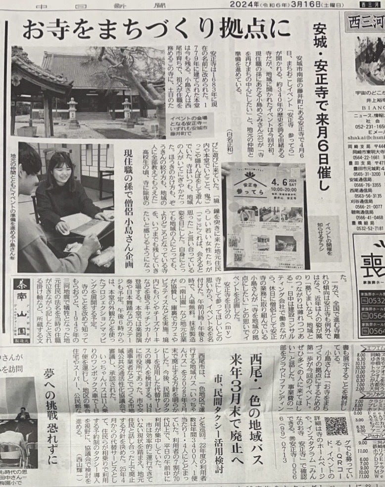 参ってら会場準備をしました!4月6日(土)参ってらまであと5日となりました!会場準備をこの土日で友人にも手伝ってもらいながら、なんとか形になりました!まだあと少し残っていますが、当日までに間に合うよう頑張りたいと思います!西尾市在住の三浦民子さんが作られた折り紙をぜひ参ってらに来られる皆様へプレゼントしてくださいとご厚意でいただきました!ぜひ、皆様お好きなものをいただいてください!また、一枚目の写真は、毛氈をひいたあと、空いたスペースに安正寺のお花教室の先生がお花を飾ってくださいました!とても華やかになりました!ありがとうございます!