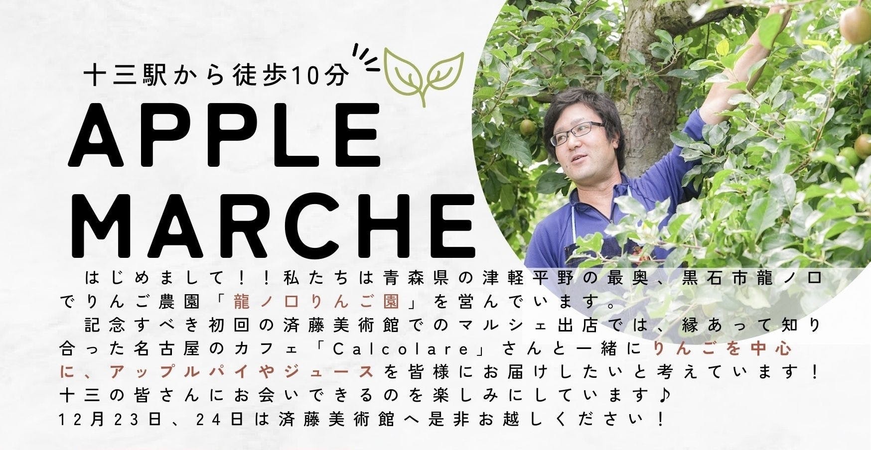 12/23〜24に龍ノ口りんご園&カルコラーレは大阪の十三にある済藤美術館にて出張出店を行います。そこでは生りんごやりんごジュースはもちろん、カルコラーレさんが作ってくださるアップルパイもご提供する予定です。
