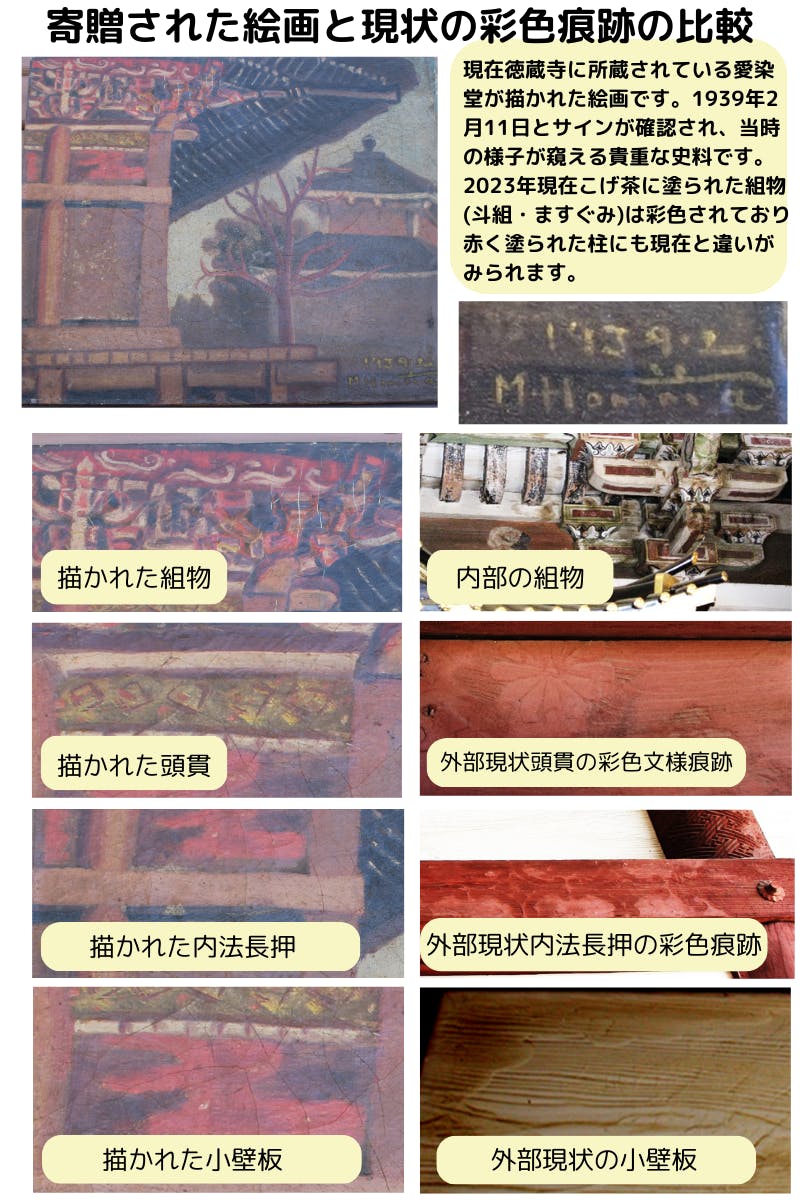 5年前檀家さんに寄贈された愛染堂の絵画をきっかけに今年度調査したところ、境内の愛染堂が1930年代に鮮やかな色彩で彩られていたことがわかりました。