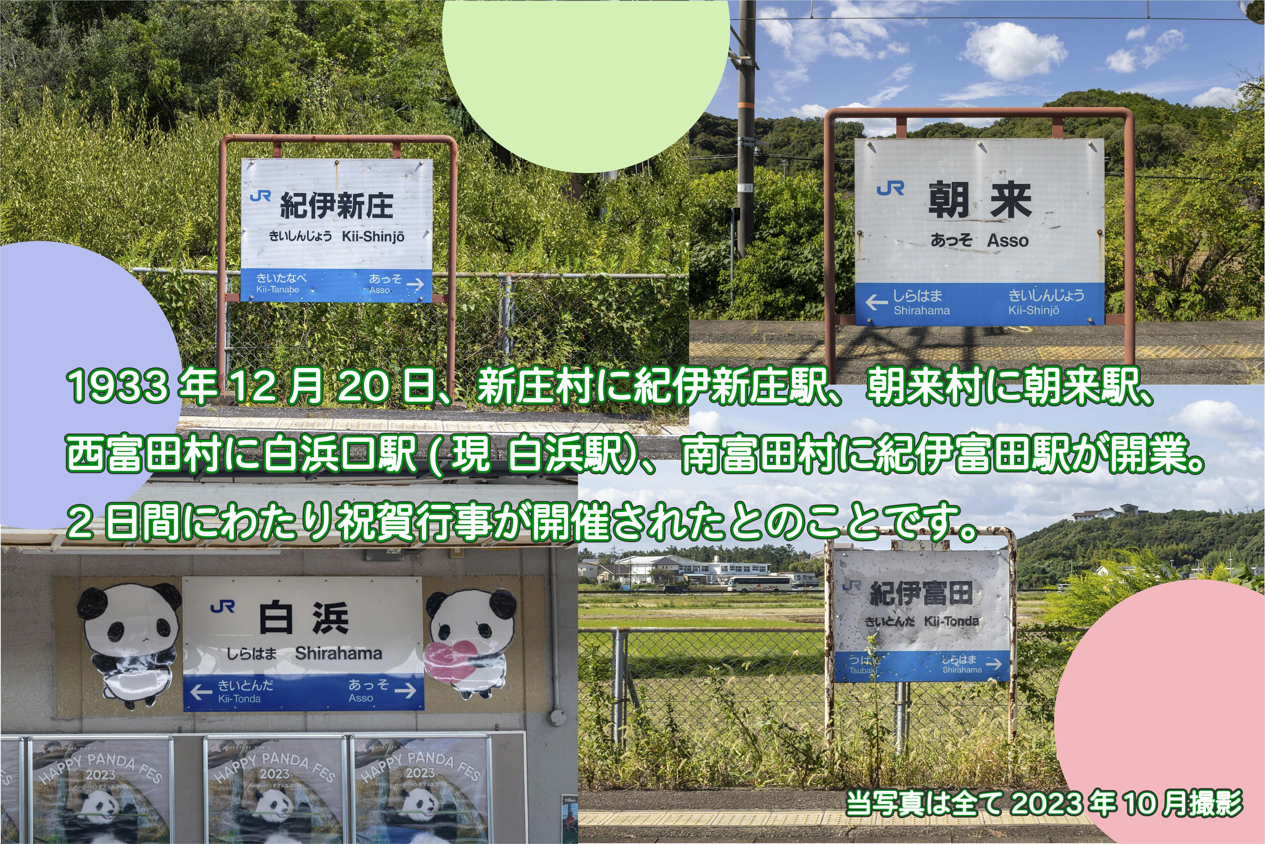 紀伊富田駅が今年で開業90周年を迎えることはお伝えしておりましたが、実は、なんと、紀伊新庄駅、朝来駅、白浜駅、紀伊富田駅は同日開業で、4駅揃って今年の12月に90周年を迎えます。