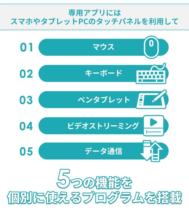 スマホやタブレットPCをマウスやキーボードに、受信側の大型モニターの画面を見ながら作業ができます。