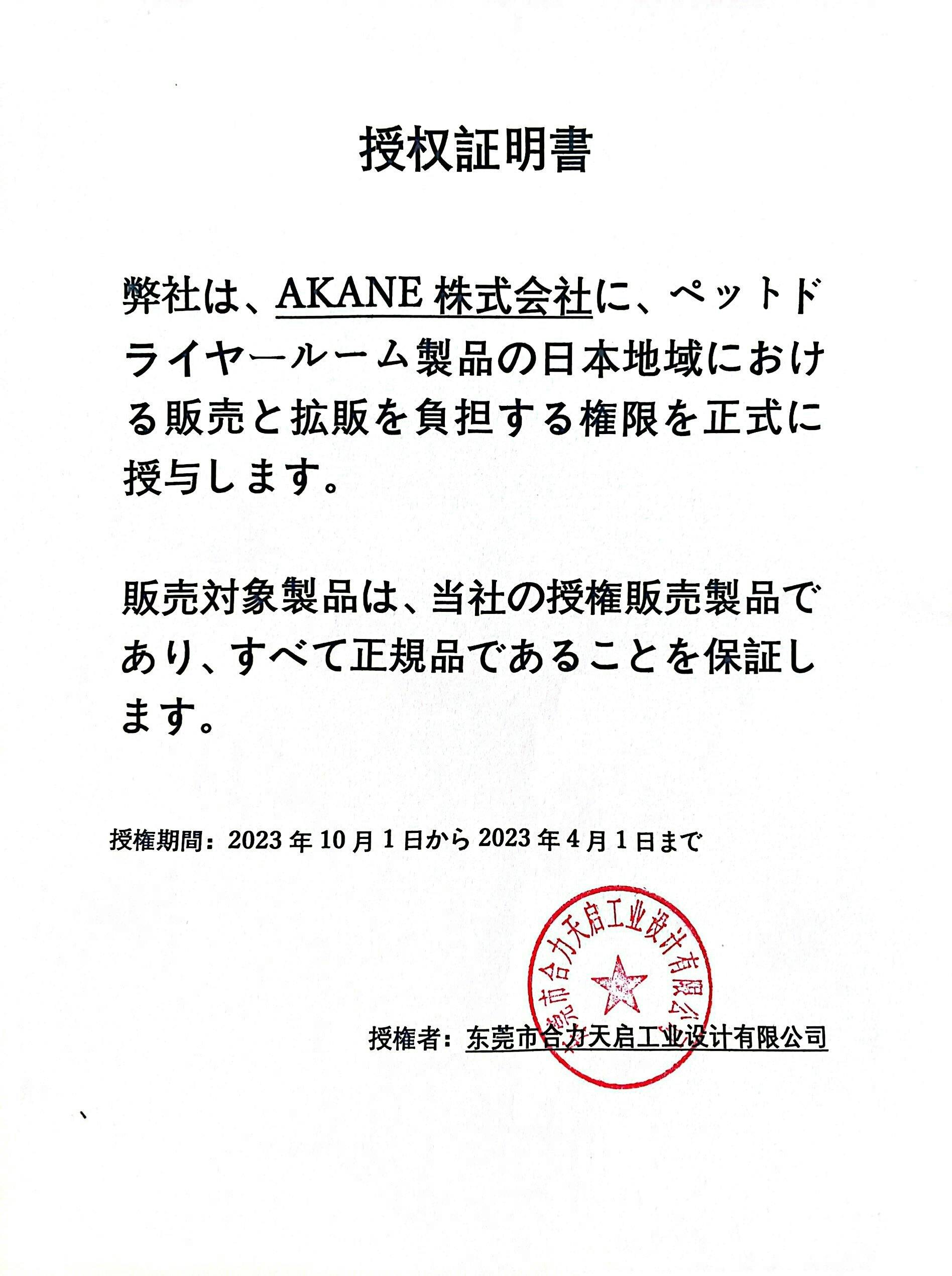 AKANE株式会社は、东莞市合力天启工业设计有限公司の製品を日本で正規に販売する公認代理店です。