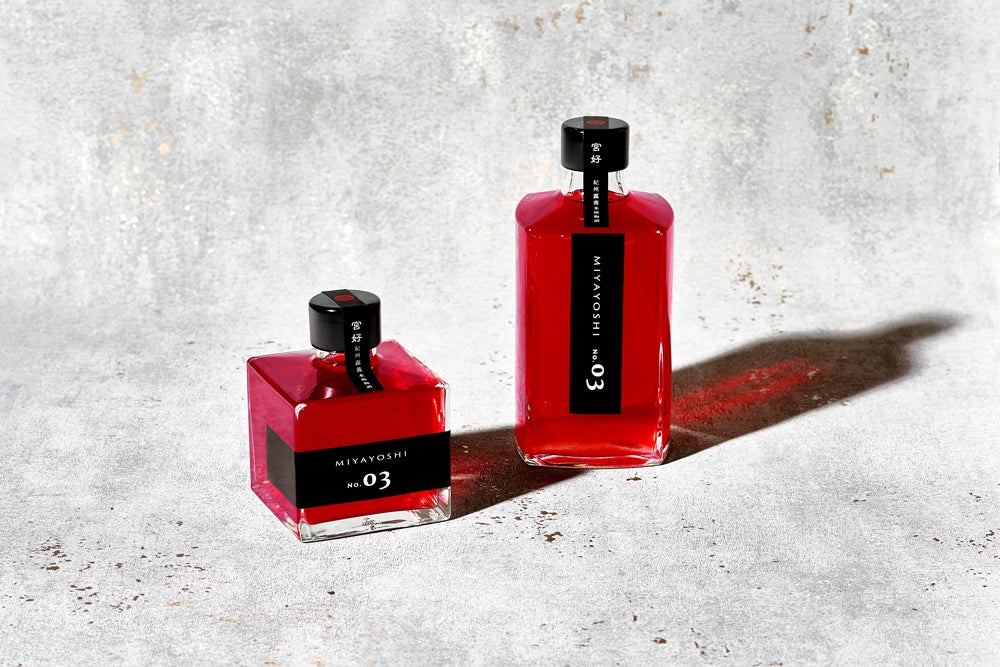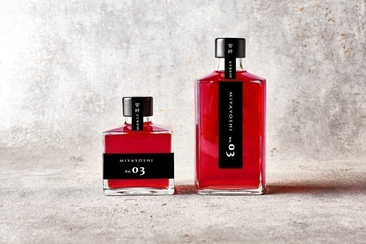 和歌山有田市の自社農園で育てた、果実まで赤い梅の希少種「露茜」を蒸留酒と同量だけ贅沢に使い、氷砂糖と漬け込んだこだわりの本格梅酒「MIYAYOSHI」は、着色料など何も使わない天然由来の透き通った鮮やかな赤色、甘酸っぱいさわやかな香り、濃厚な味わいの中にも後味をすっきりさせる独自の酸味が特徴です。