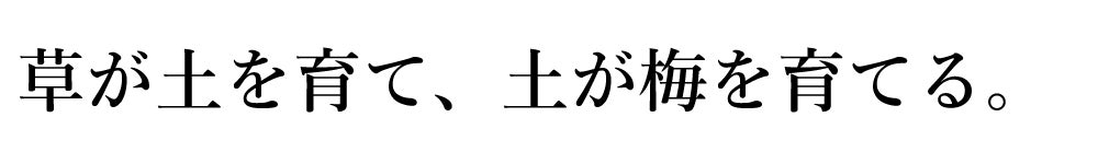 宮好の農園では、可能な限り自然の生態系をそのままに草生栽培を行います。生きた草の根は土を耕し、梅の木を支える土が雨風により流出することを防ぎます。刈り取った草はそのまま有機物となり、土を肥します。そうしてできた肥よくな土は、味わい豊かできれいな赤い露茜を育てます。