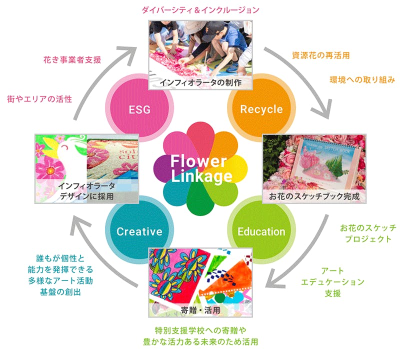 ひと花ひと花に思いを込め、皆さんと一緒に大きな花絵を創りあげたいと思います。そしてこの花絵に使用した花々は廃棄せず再資源化を行い、再生紙として生まれかわります!