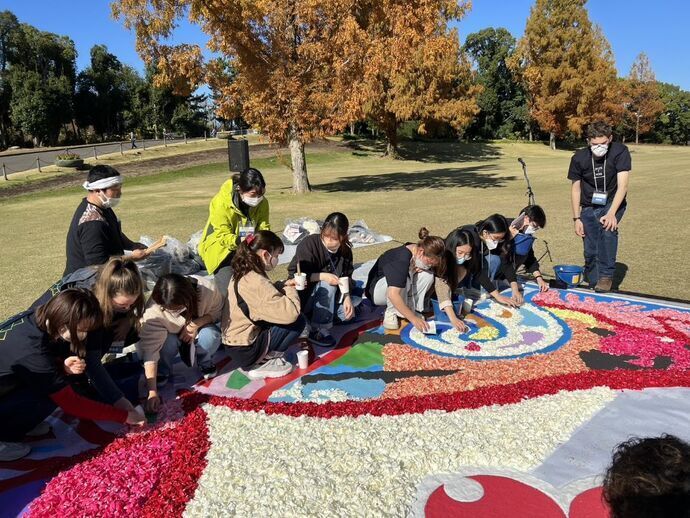 こんにちは。OsakaFlowerCarpet実行委員会です。本日無事に花絵制作が終了しました!朝早くから支援者の皆さまと関西大学の学生さん、そしてスタッフの皆で黙々と作業に取りかかりました。お花に無い色のところはおがくずに着色したものを使って色を付けていきます。普段はカラーサンドを使うことが多いのですが、おがくずを使うことでふんわりとした絵に仕上がるのです!そして予定よりも早く素敵な花絵が出来上がりましたよ〜花絵は26日日曜日まで展示しております!そして第2会場のららぽーとEXPOCITYでは通りがかったお客様に制作に加わっていただきました!こちらは造花を使用しているのでクリスマスまで楽しんでいただくことができますよ!両会場とも皆様のご来場心よりお待ちしております。