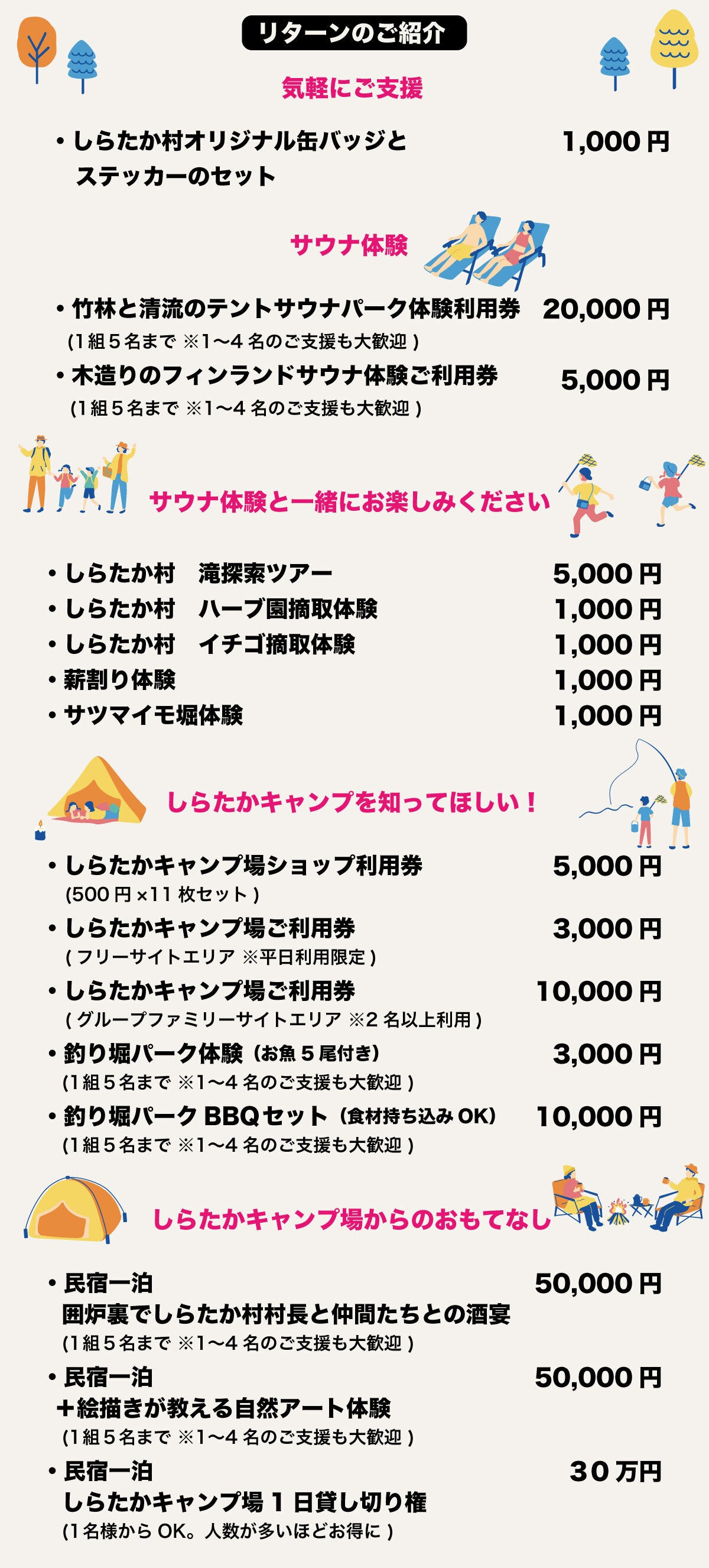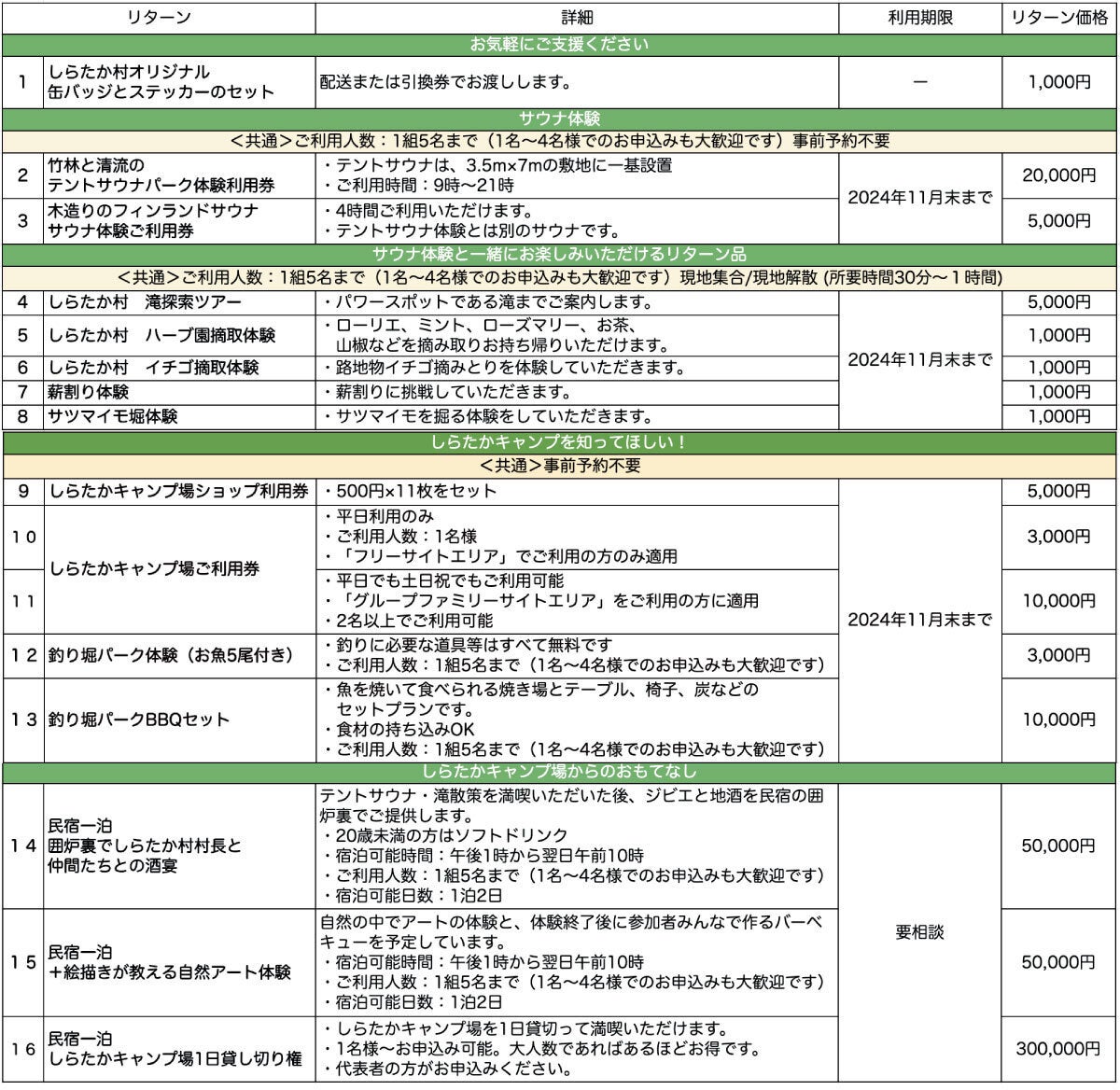 新しくできるテントサウナパーク体験の他、しらたか村の豊かな自然を活かした体験プランをクラウドファンディング限定でご用意しました!また、せっかく訪れていただくなら私たちと交流してほしい!ということで『しらたかキャンプ場からのおもてなし』民泊プランを作ってみました。テントサウナ・滝散策の後に、ジビエ料理と地酒を民宿の囲炉裏を囲んで村長含む村人たちと酒宴を楽しみましょう!またアートがお好きな方には大自然アート体験とバーベキューのプランもおすすめです。一度来ていただいたらみんなファミリーです!幸せな時間を一緒に過ごしましょう。