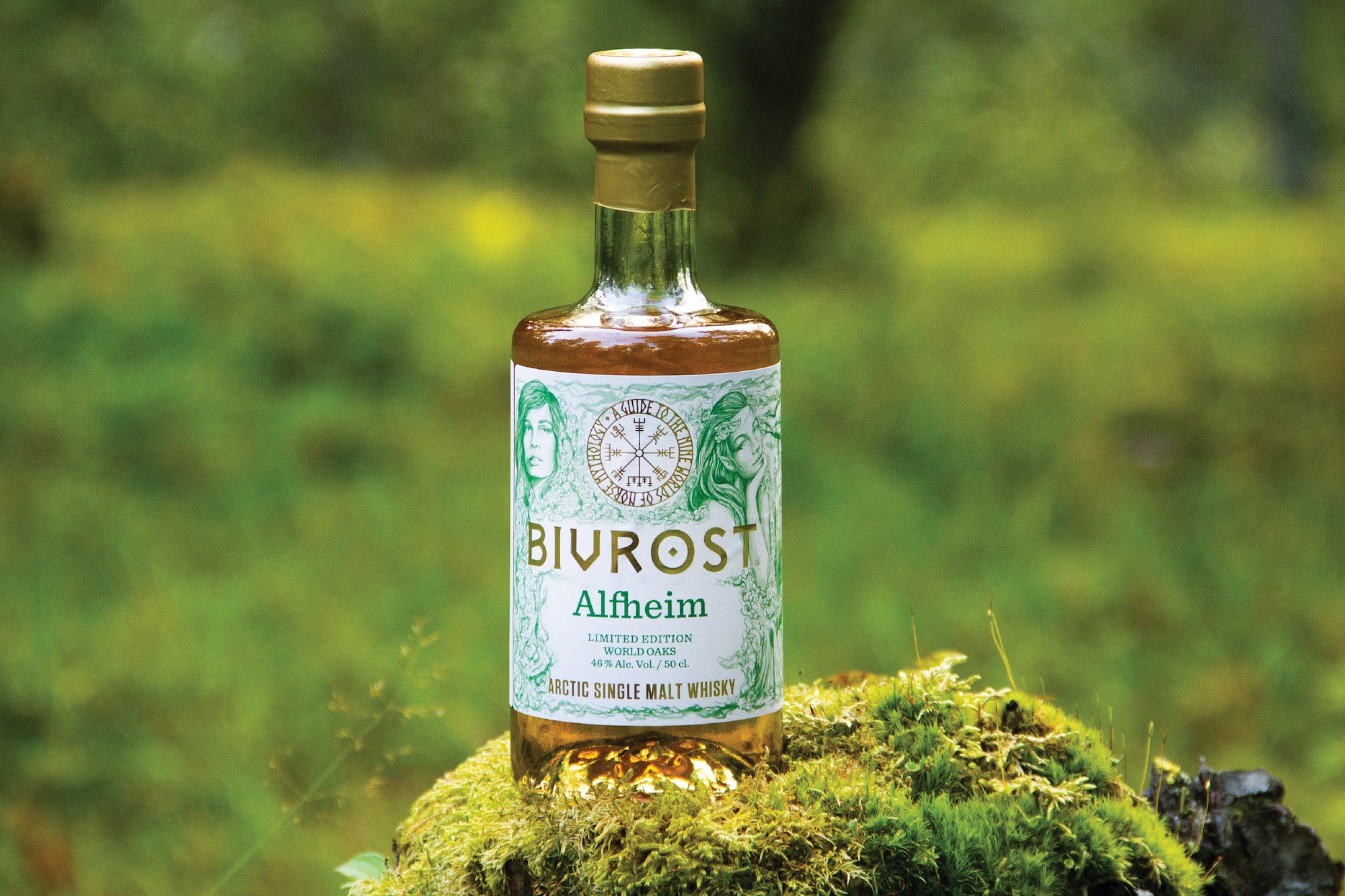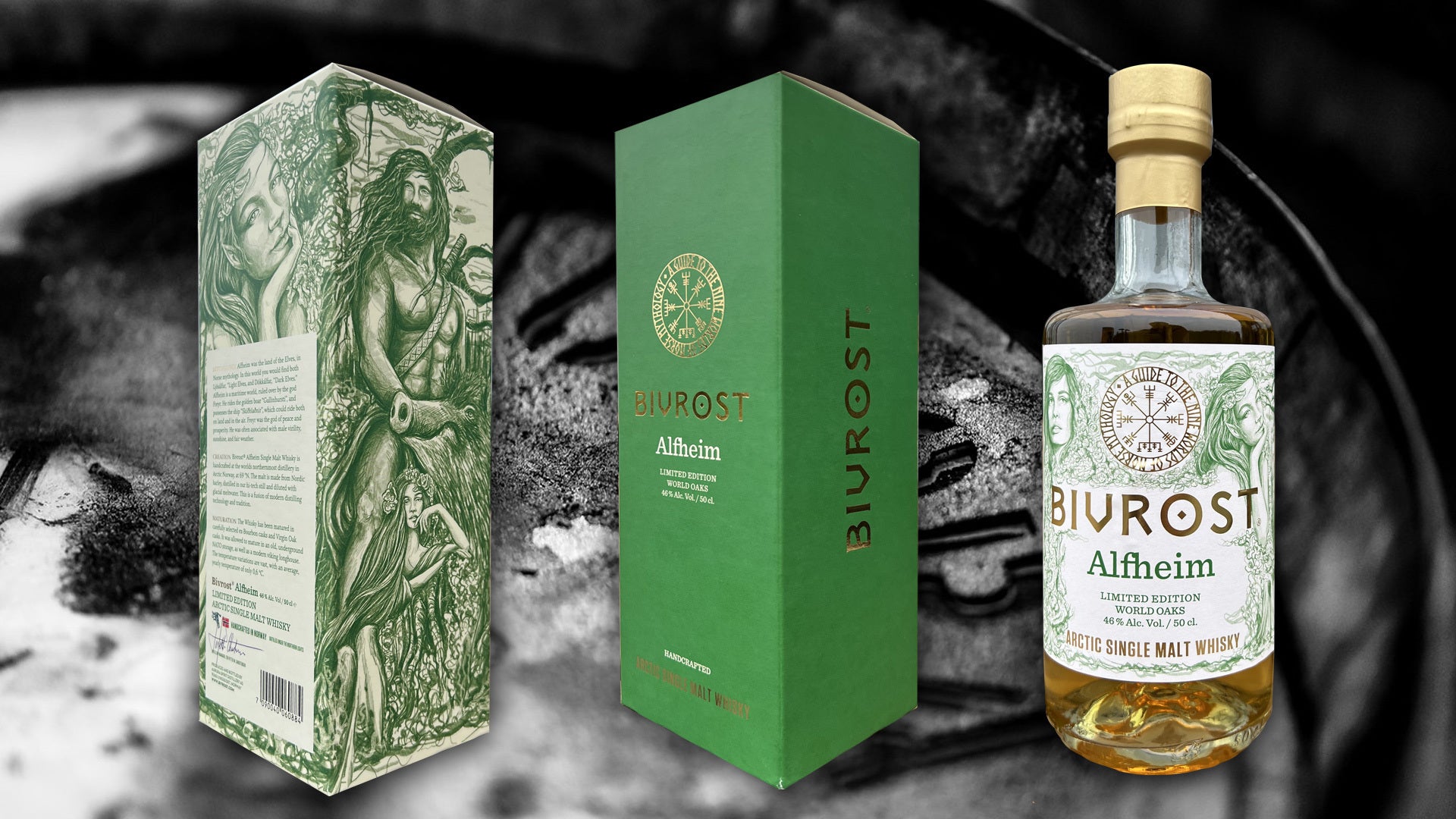 そんな「アルフハイム」をイメージしたウイスキーは、生命感あふれる美の象徴とも言えるオークの木を意識した美しいグリーンをベースとしたラベル及びボックスのデザインとなっており、黄金の猪にまたがるフレイ神と美しいエルフたちが描かれている。世界中の様々なオークの木で作った樽で熟成された「ワールド·オーク·ウイスキー」は、「北欧神話9つの世界」のシリーズ上、最もパワフルな味わいを持つ、ウッディなオーク感たっぷりのシングルモルトウイスキーへと仕上がっている。