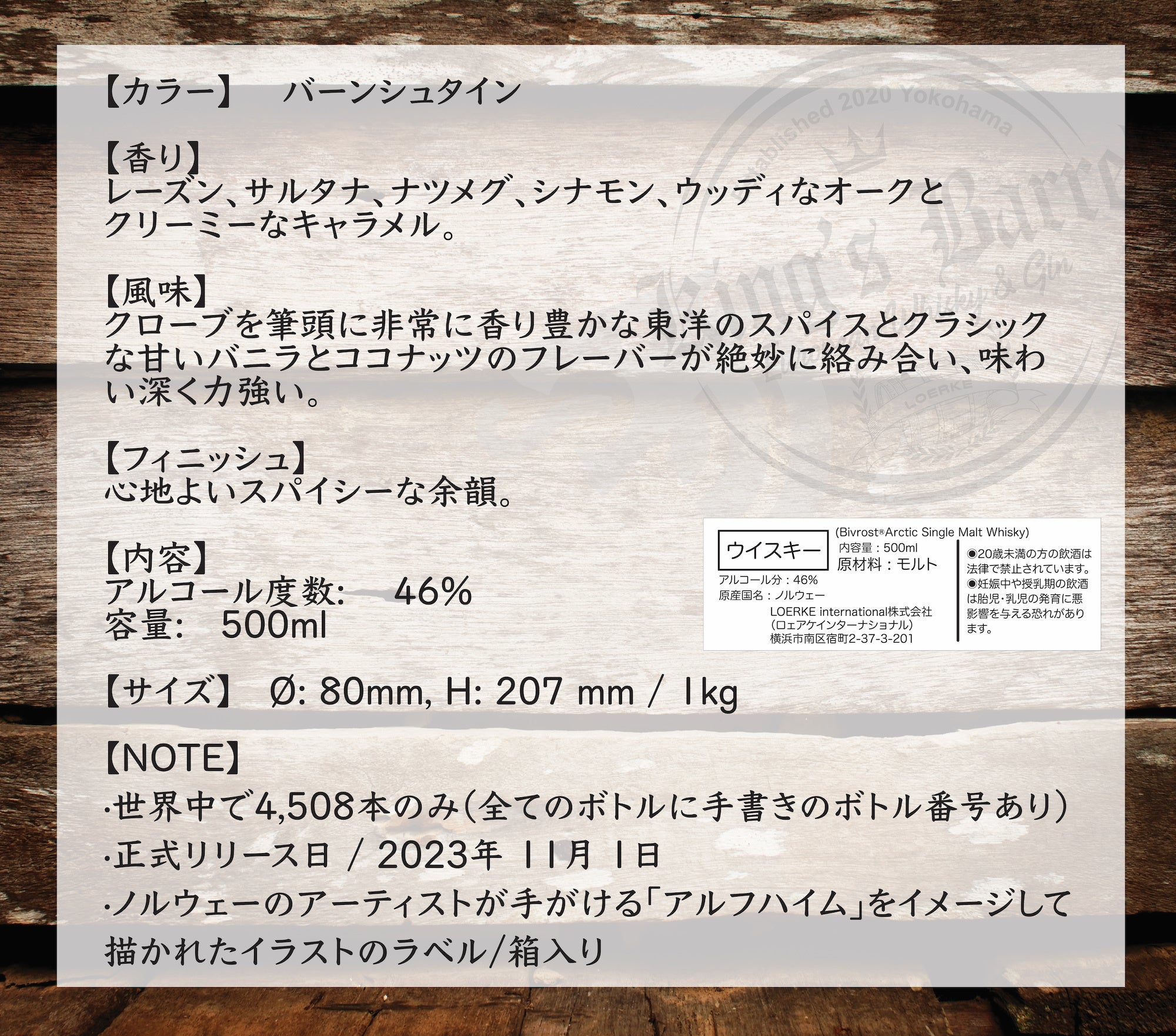 そんなヨトゥンハイムをイメージしたウイスキーは、北欧の大麦とリンゲンアルプスの氷河の融解水を使用して丁寧に作られ、選び抜かれたバーボン樽と元スタウトのビール樽で熟成される。