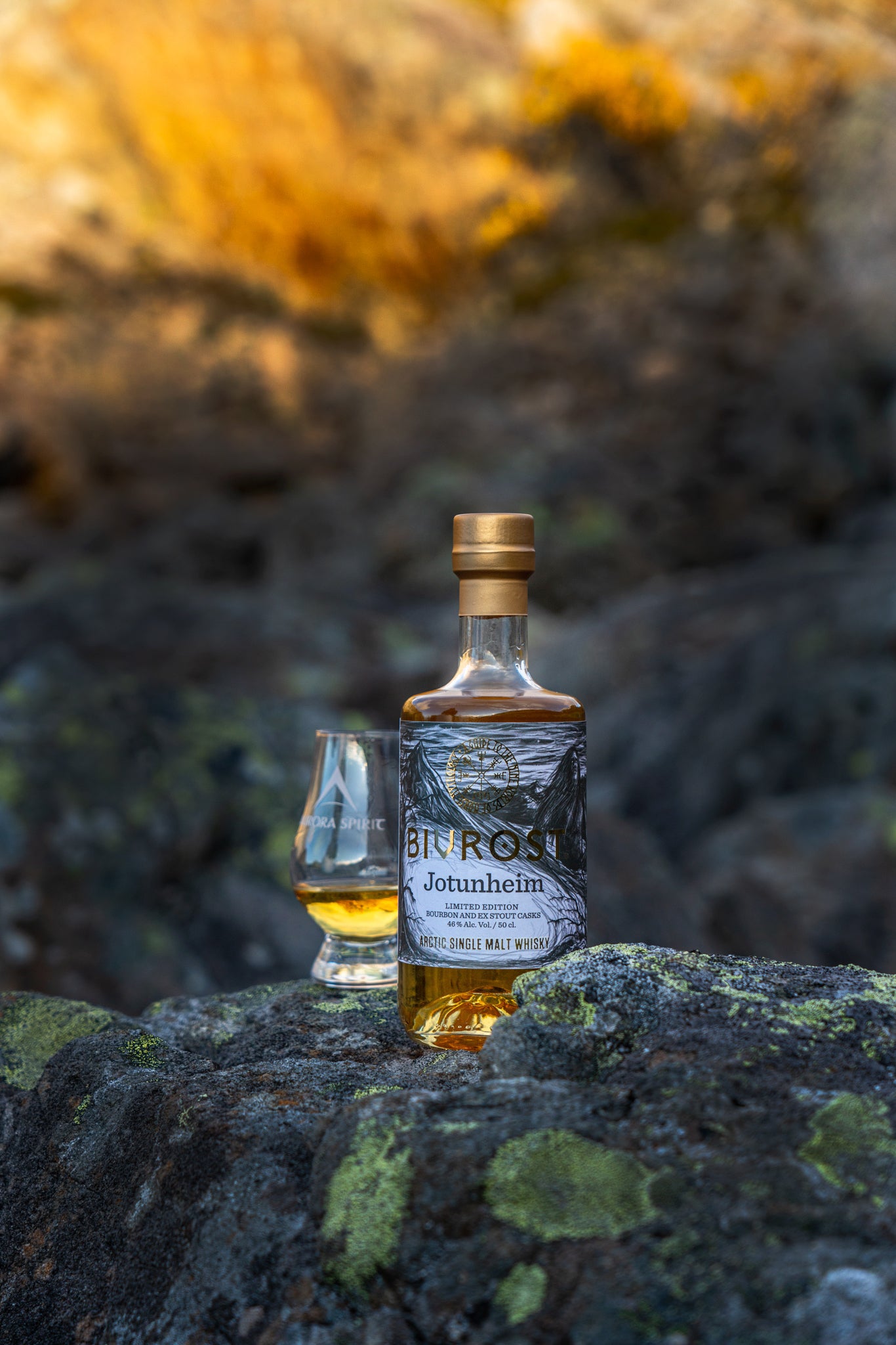 北緯69°のノルウェーの雄大なリンゲンアルプスの麓にあるオーロラの輝きの下で手作りされる、オーロラ・スピリット蒸溜所の「北欧神話の9つの世界」シリーズの4番目のウイスキーであるBIVROST ヨトゥンハイム 北極シングルモルトウイスキー。