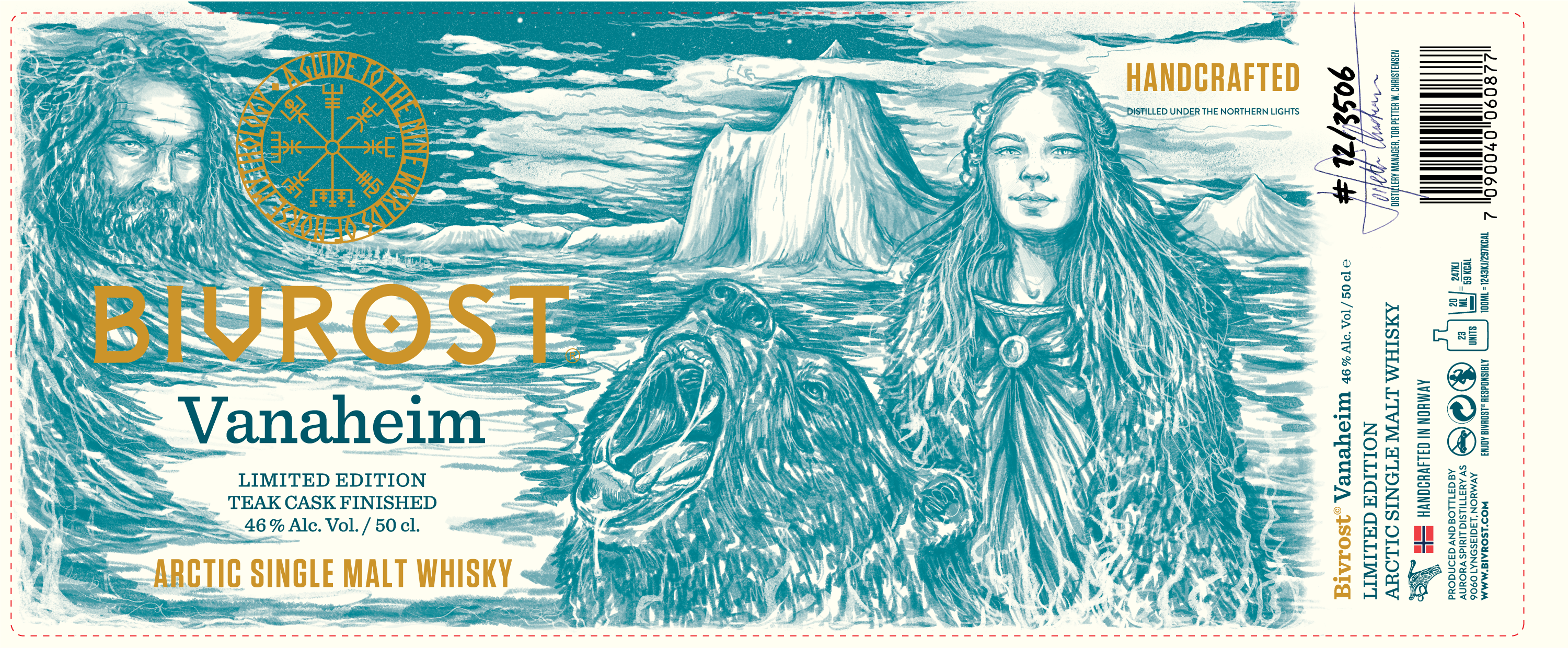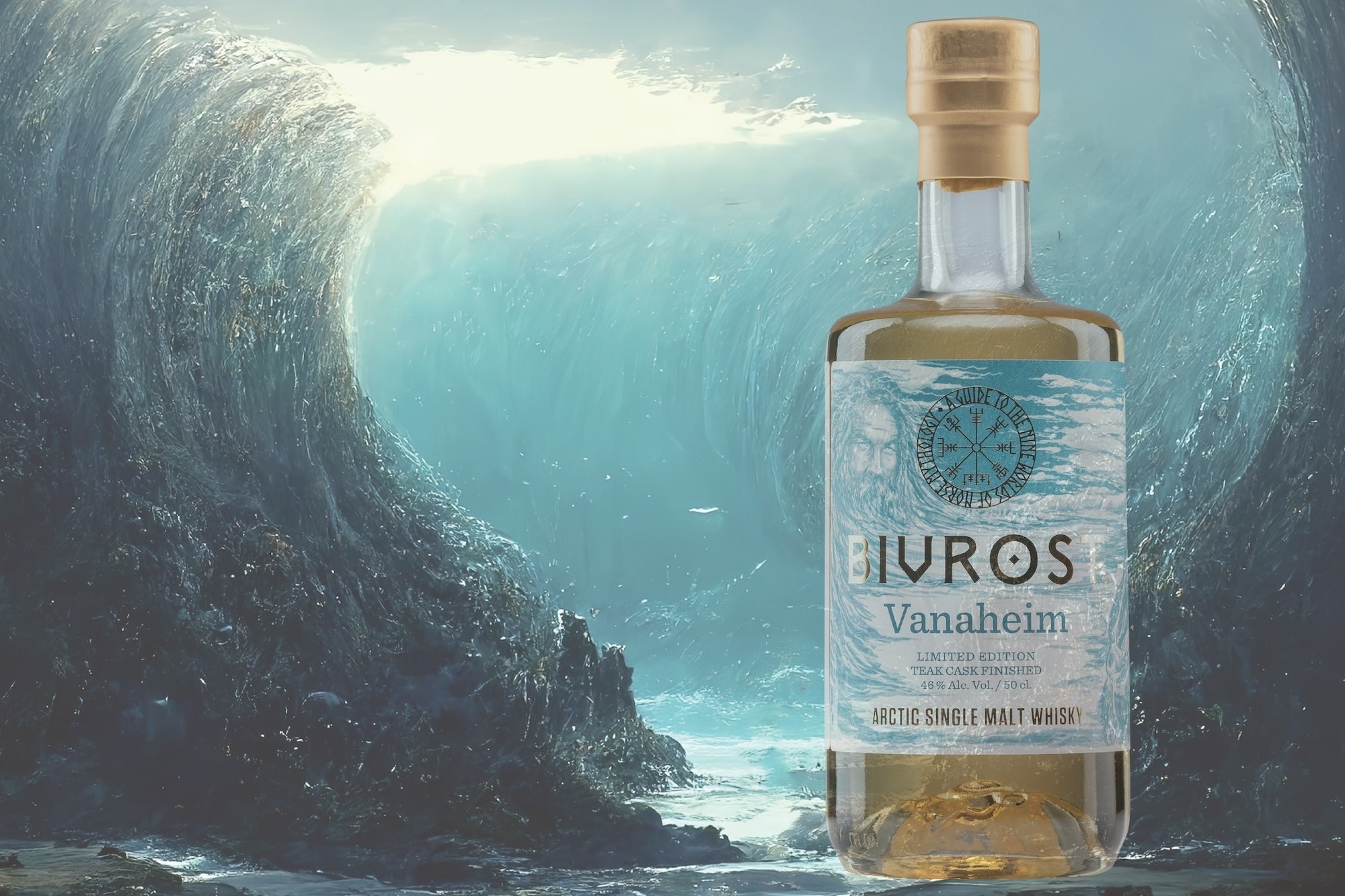 そんな航海の守護神ニョルズの国を彷彿とさせる海の底のような美しいエメラルドブルーを基調とした「BIVROST 北欧神話9つの世界シリーズ」のシリーズ第7番目となる「ヴァナハイム」は氷のように冷たい大地、ノルウェーの北極圏で氷河の融解水と北欧の大麦から作られ、ハイテク蒸留器で蒸留された後、選び抜かれたバーボン、シェリー樽で熟成され、最後はなんとチーク樽で完成される。世界的に見てもチーク樽を使用したウイスキーは非常に珍しいので、チーク樽がウイスキーにどのような影響を与えるのかという統計はまだ存在しない。