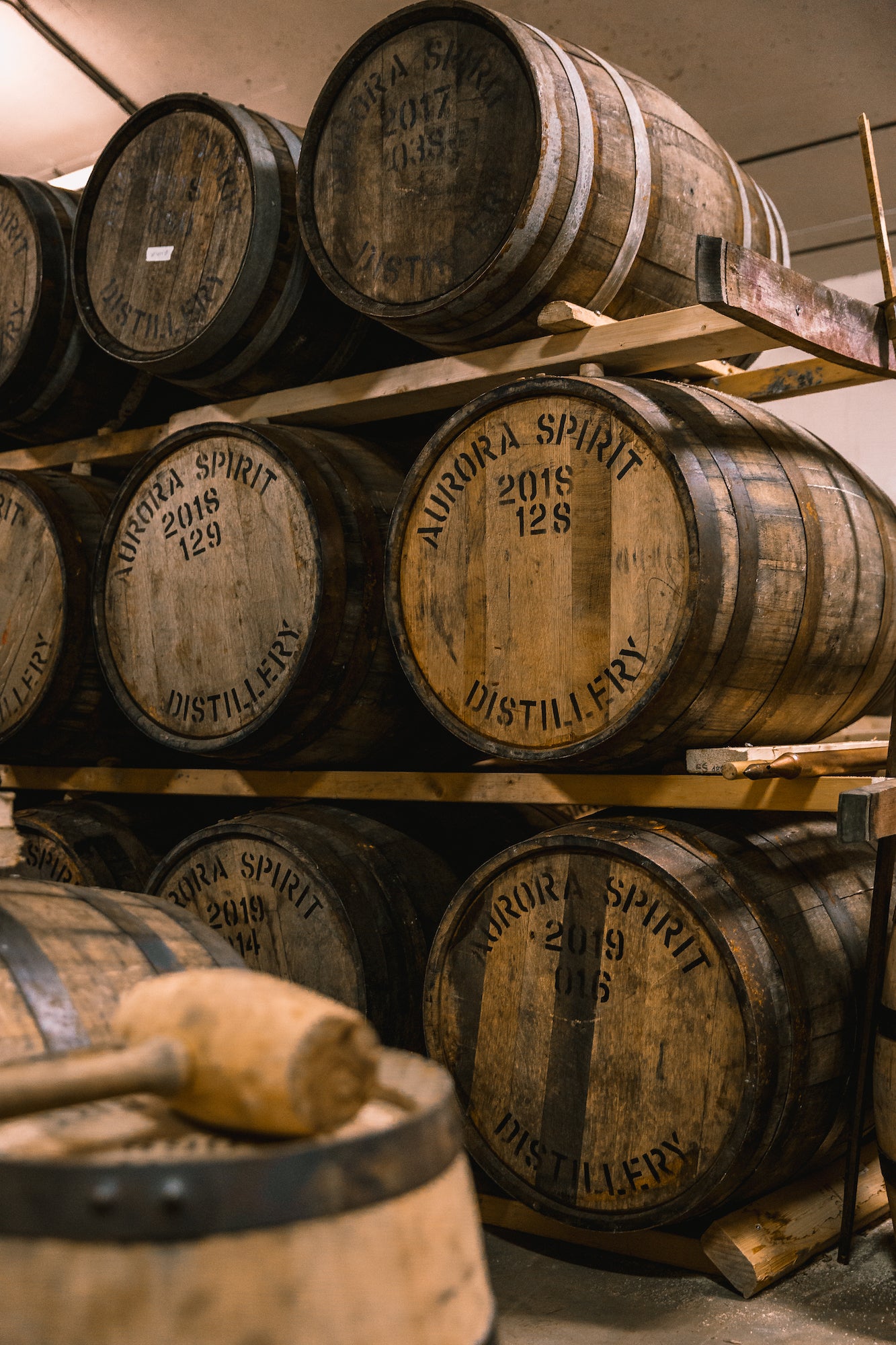 暑い日には樽内の圧力が高まって膨張し、酒が樽の奥深くまで浸透する。 逆に気温が下がると酒に樽の風味がより染み込むという、スピリッツと樽のこういった相互作用は樽の熟成に欠かせない大切な要素だ。さらに、比較的小規模な蒸溜所である「オーロラ・スピリット」では通常に比べ小さめの樽を使用しており、大きな樽と比べ、小さな樽の中では酒が樽に接する割合がその分増え、その結果、ウイスキーの個性がより早く形成され、樽由来の香りや風味がより色濃く押し出されるのだ。