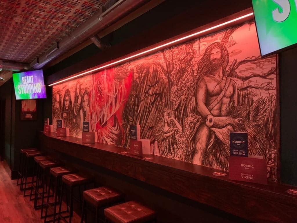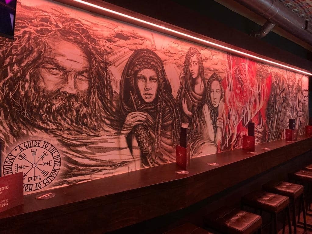 その人気を裏付けるように、最近イギリスのとあるバーは、ビヴロストウイスキーのイラストデザインを手がけるノルウェーのアーティスト「Kine Yvonne Kjær」が制作した「ビブロスト スピリッツ - アート」で壁全体を飾ったそうです!歴代の8番目までのウイスキーのメインイラストが集合した壁画のようになっていて、ものすごくクールですね!