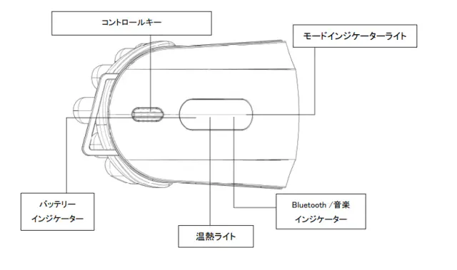 長押しして電源のオン/オフを切り替えます。 短押しでモードを切り替え、ダブルタップで温熱のオン /オフを切り替え、トリプルタップで音楽の視聴/一時停止をします
