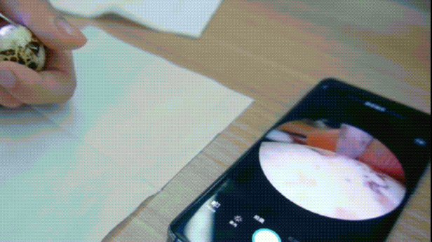 うずらの卵を使って超音波で威力を検証。みるみると茶色い部分が取れていく様子が分かります。