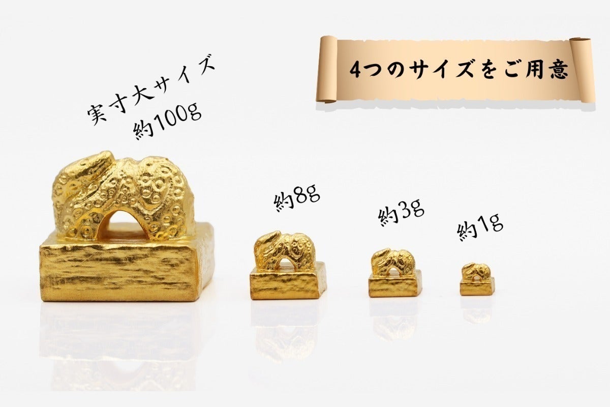 実寸大サイズは「一辺の平均2.347cm、総高2.236cm、重さ108.729g、体積6.0625cm³」に合わせて作った「約100g」の純金の金印です。こちらは、今回は販売はしておりませんので、イメージとなります。