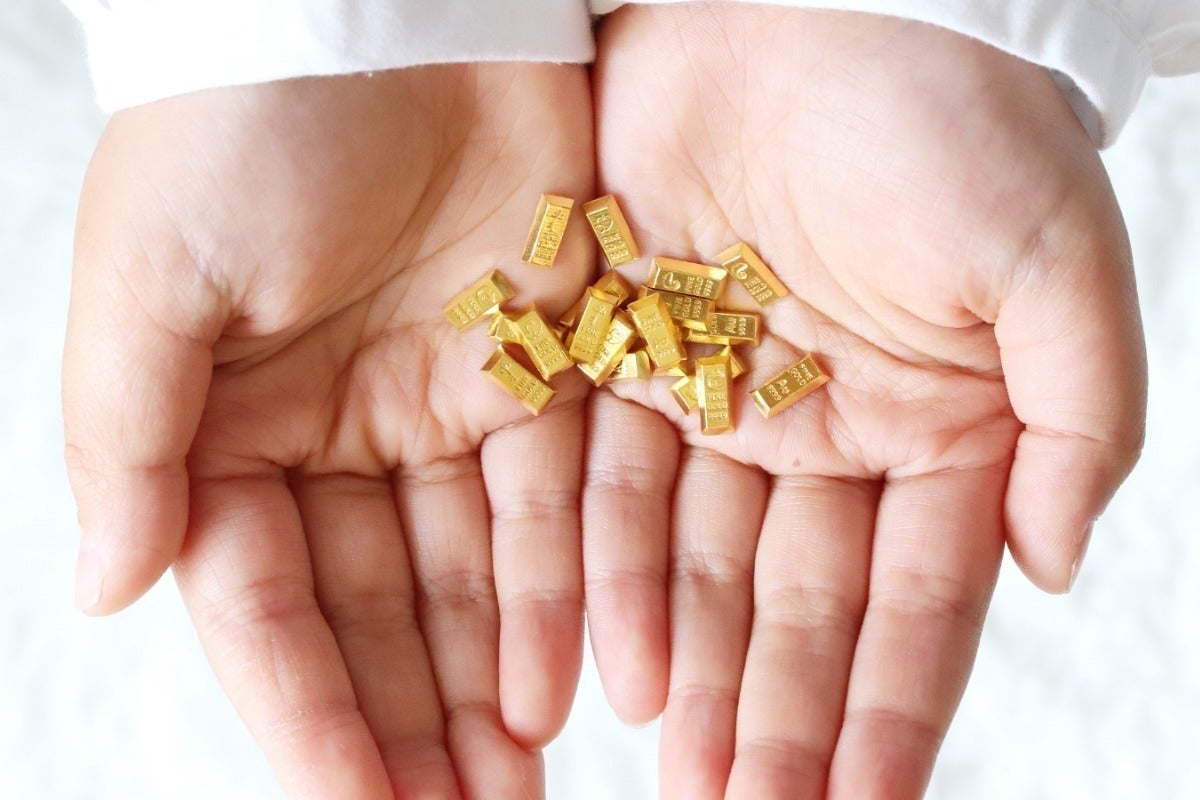 指先にちょこんと乗る、精巧なミニチュアサイズ。小さく持てる、インゴット型!