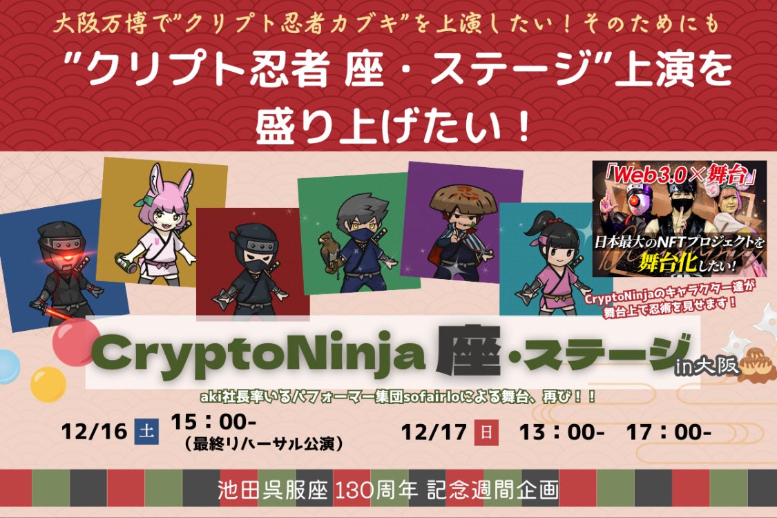 私たちは現在、このプロジェクトの準備を進めていますが、東京からパフォーマーを招く必要があり、さらに出演人数を増やし、舞台稽古もきちんと行う必要があります。そして、子供たちや配信を通じてたくさんの方に観て欲しいと思います。そこで、クラウドファンディングを通じて皆さんの支援をお願いしたいと思います。私たちと一緒に西日本初の「クリプト忍者座・ステージ」を楽しみ、中央集権ではなく、自律分散のDAOやWeb3が作り上げた文化の上に立つ「クリプト忍者」の舞台を盛り上げましょう。成功すれば、大阪万博で世界に向けてクリプト忍者をリアルにアピールする「クリプト忍者カブキ」を作り出せるでしょう。若い人々や世界中の人々に、「クリプト忍者×歌舞伎」を見せたいと思っています。今回の”座・ステージ”はそのための第1歩です。皆さんのご支援を心からお願い申し上げます。