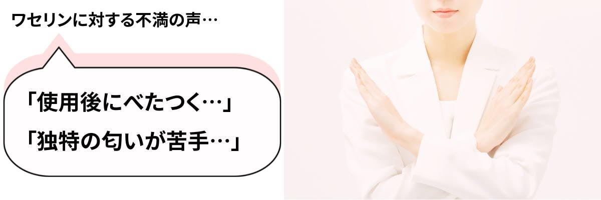 - しかし、その反面「使用後にべたつく」「ワセリンの独特な匂いが苦手」というような、既存のワセリンに対する不満を感じたことのある方も少なくはないのでしょうか。