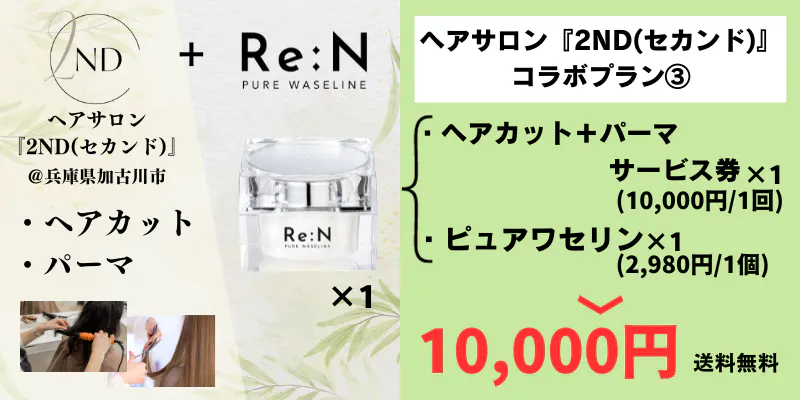 ・ヘアサロン『2ND(セカンド)』ヘアカット+パーマ サービス券 ×1回 + ピュアワセリン ×1個 10,000円(送料無料)