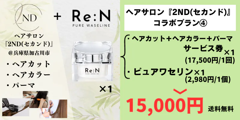 ・ヘアサロン『2ND(セカンド)』ヘアカット+ヘアカラー+パーマ サービス券 ×1回 + ピュアワセリン ×1個 15,000円(送料無料)