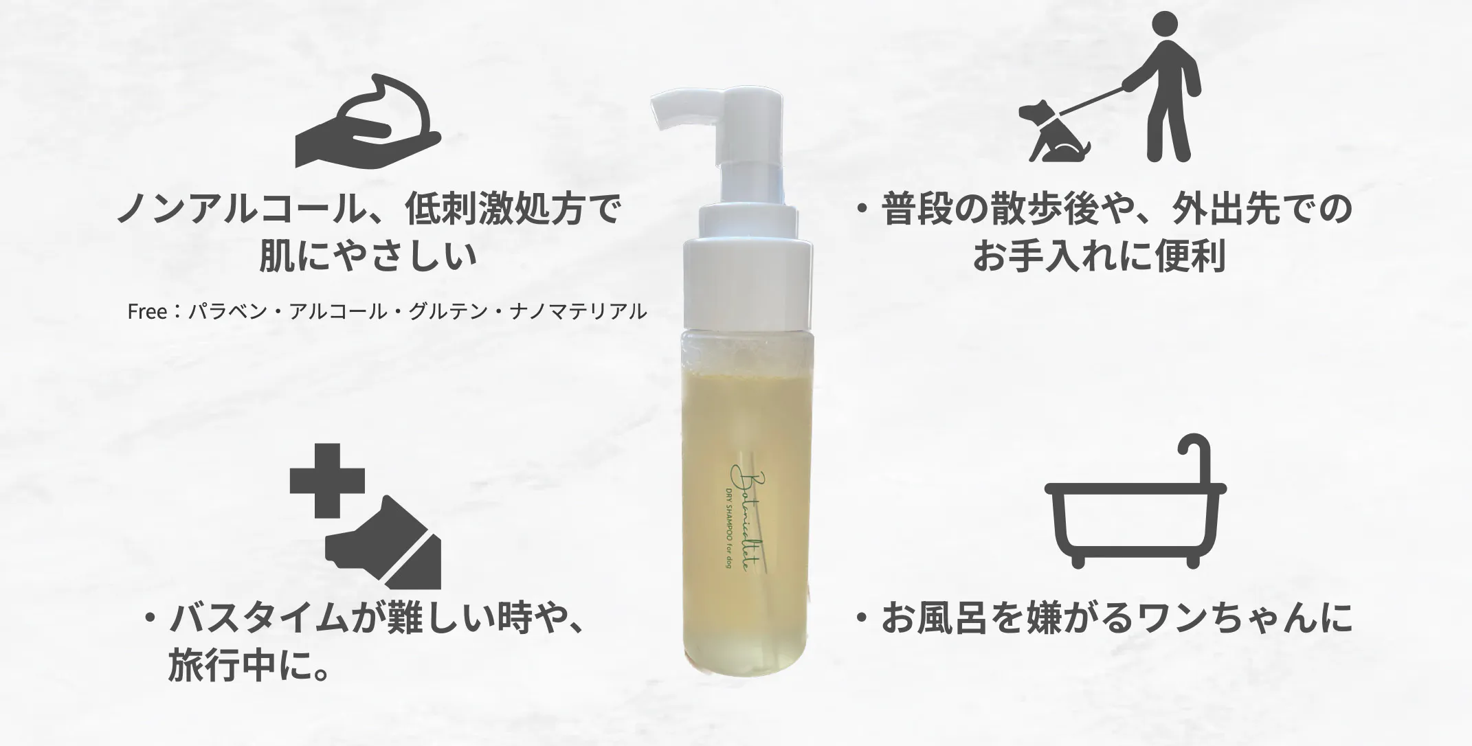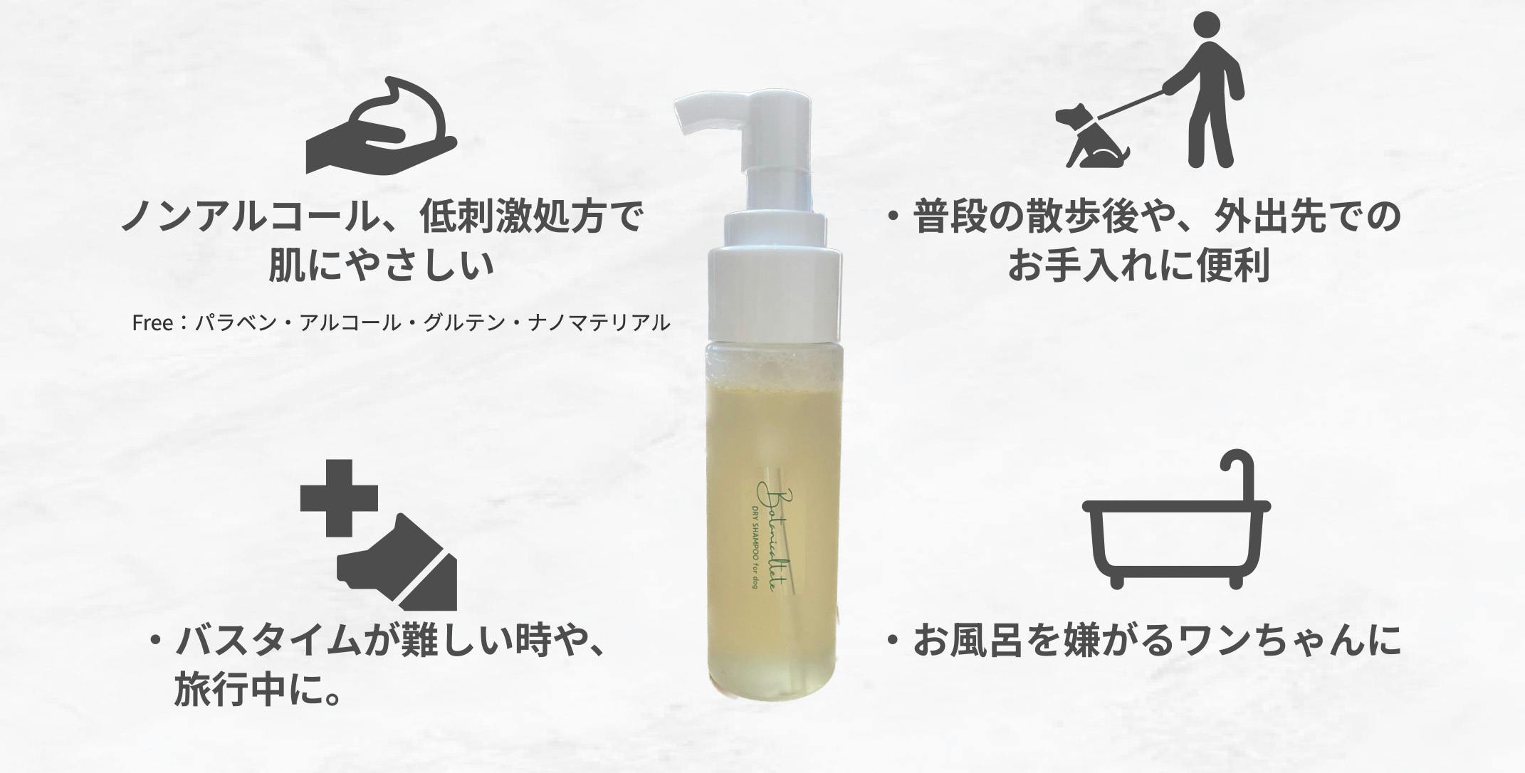 そのノウハウも活かし、よりワンちゃんに寄り添ったシャンプーをという想いから「Botanicaltete Drysyampoo for dog」を制作しました。
