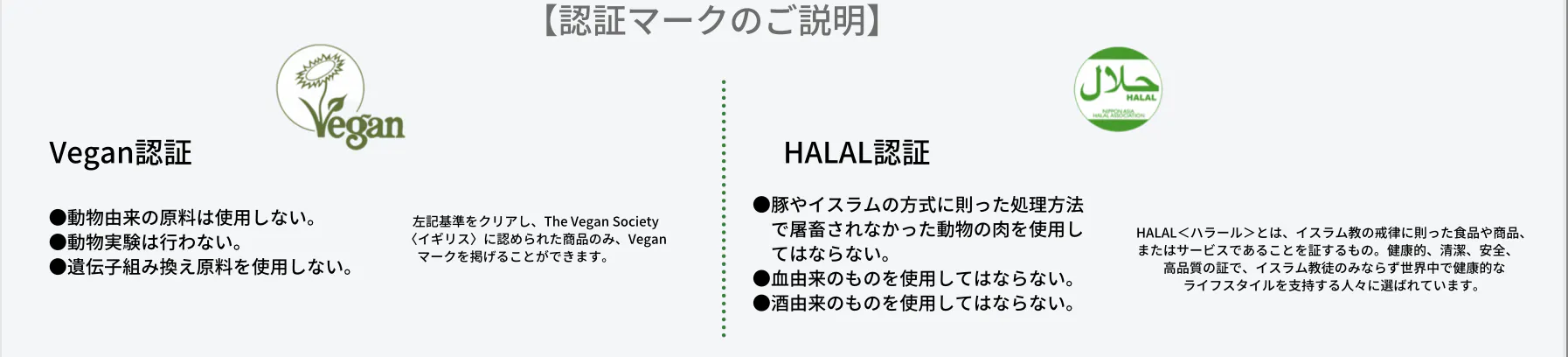 VEGAN認証とHALAL認証を取得しています。