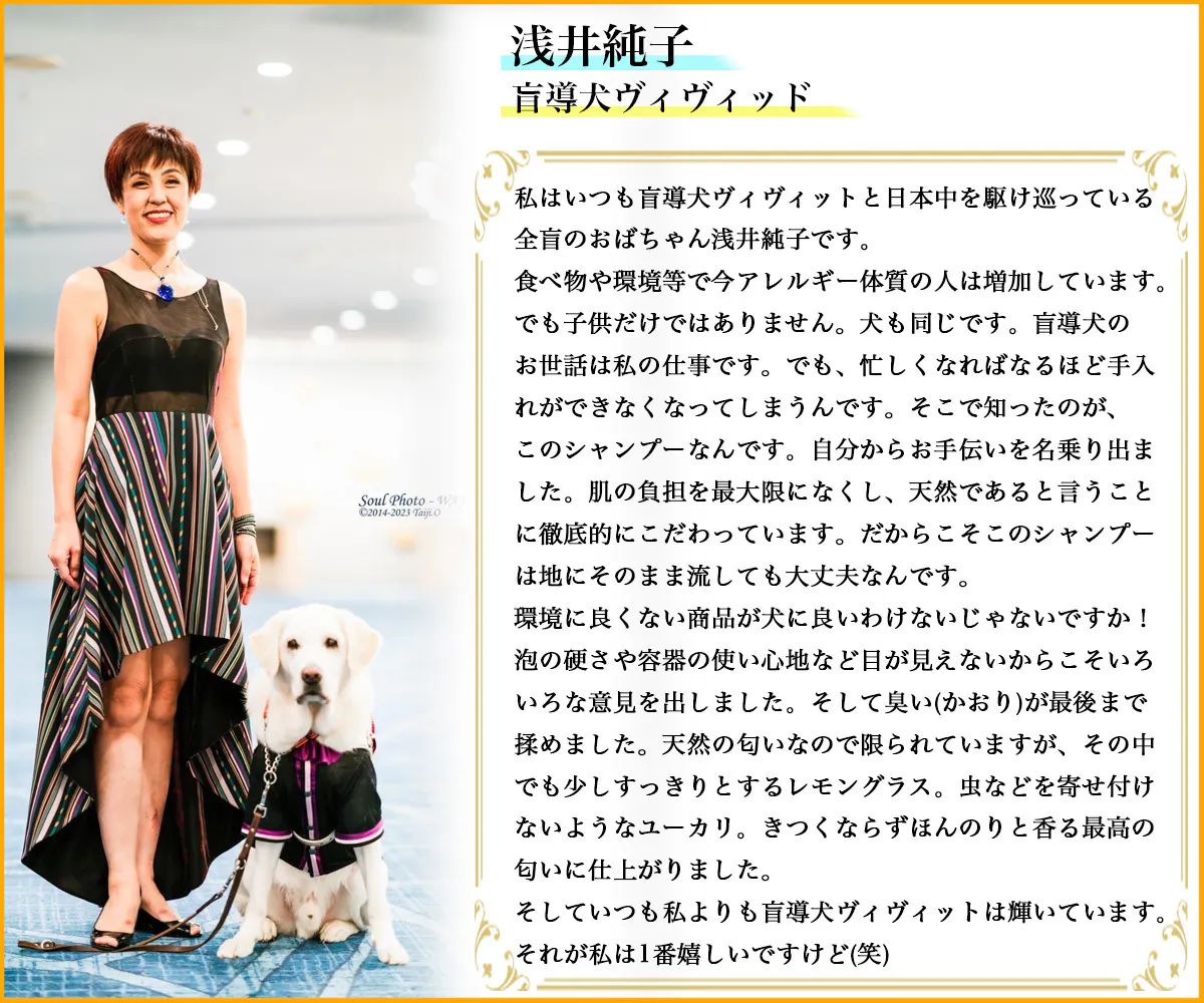 一心同体のパートナーでもある盲導犬ヴィヴィッドに、あるいは肌の弱いワンちゃんたちに、とにかく肌に優しいシャンプーを、という思いから開発の初期段階からご協力頂いております。