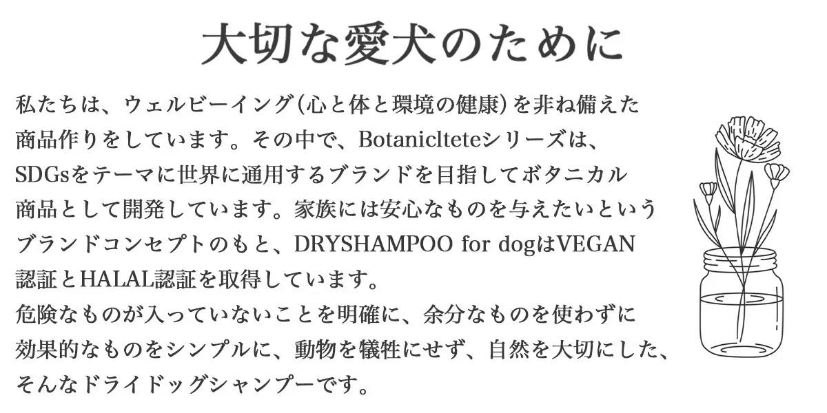 「Botanicaltete DRY SHAMPOO for dog」は、試行錯誤しながらも本当に多くの方にご協力頂き、完成させることが出来ました。自信を持って皆様にお届け出来る商品になったと思います。