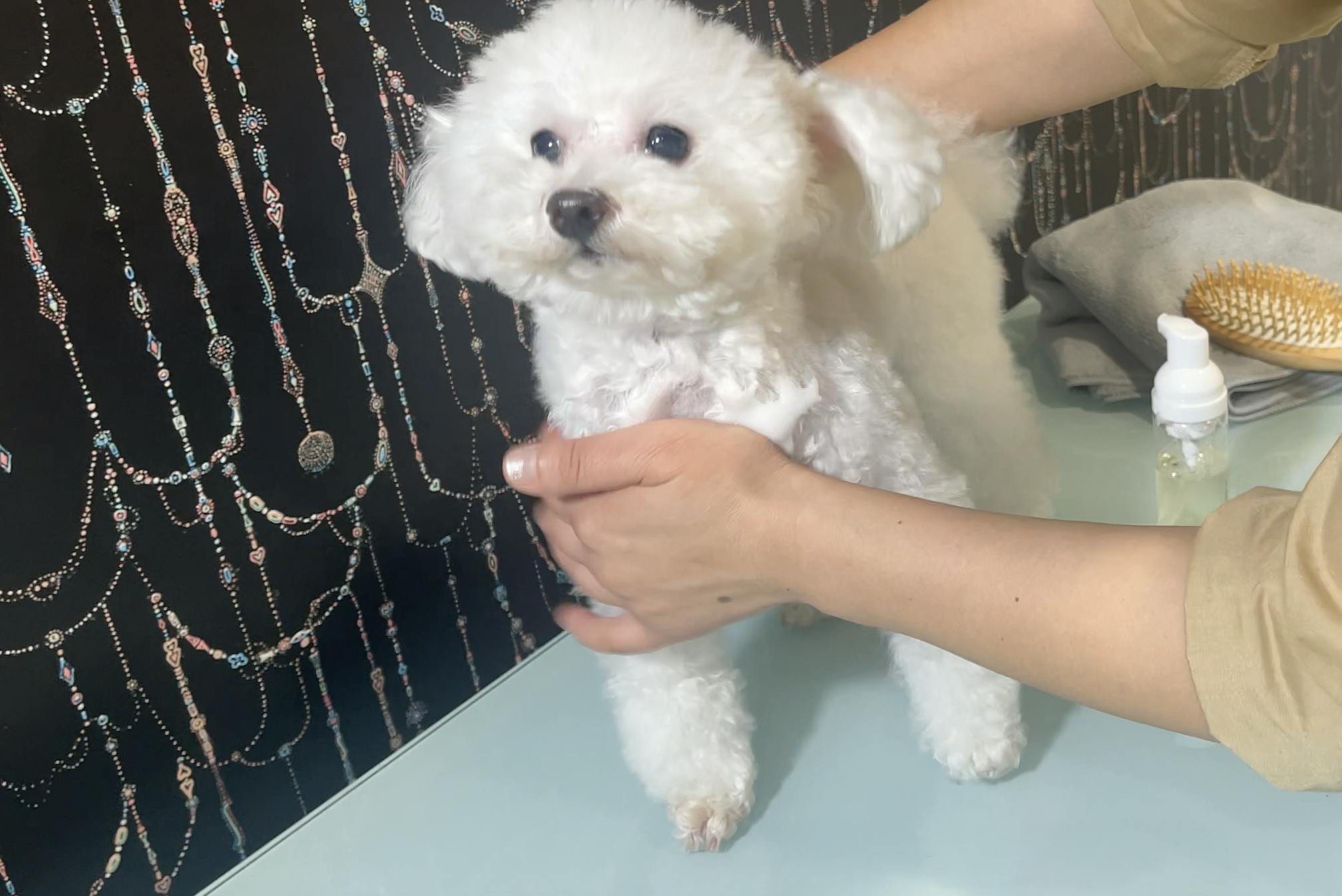 ドライタオルで拭き取ります。毛足の長いワンちゃんは、ドライタオルの前にウェットタオルで拭き取るとよりスッキリ仕上がります。