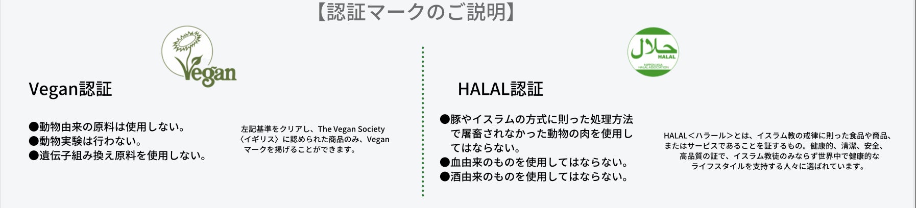 VEGAN認証とHALAL認証を取得しています。