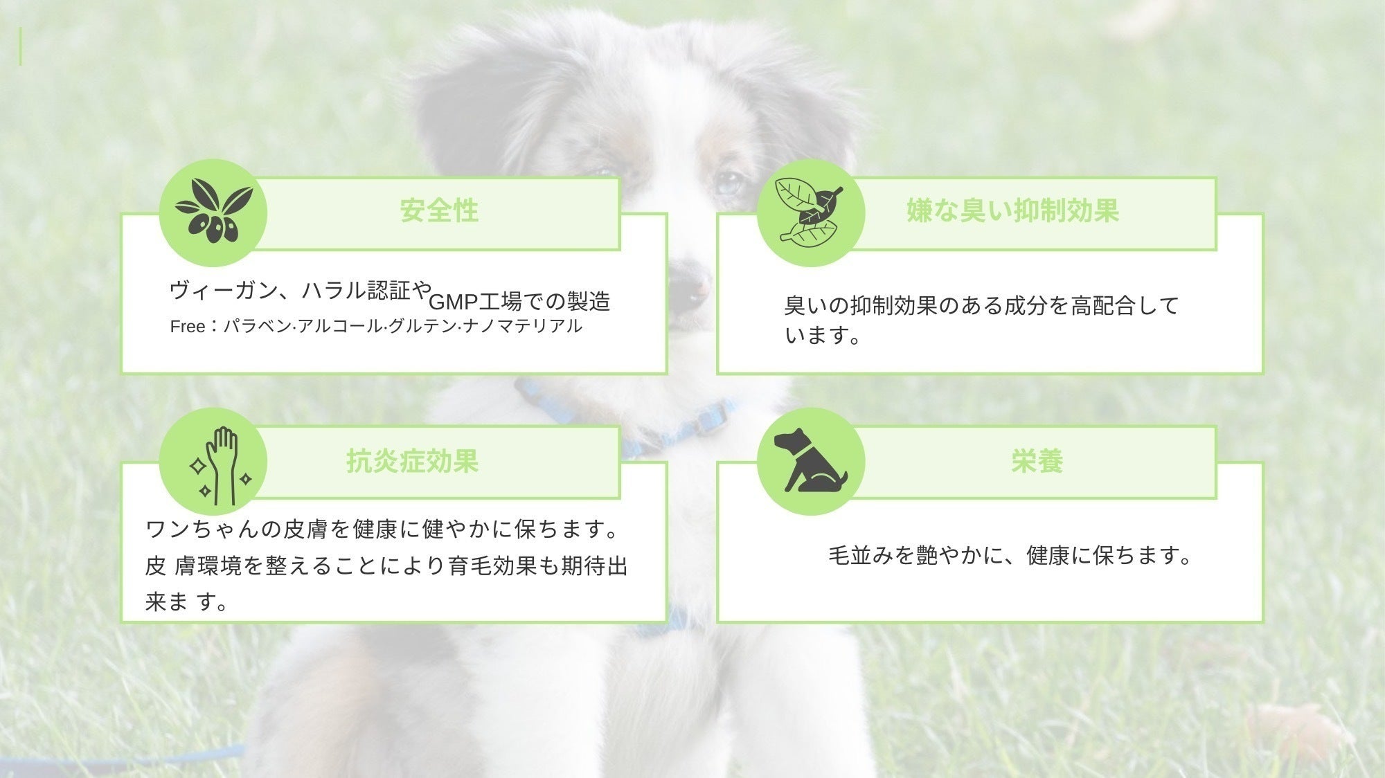 また、臭いを抑制する成分を高配合しており、愛犬を清潔に美しく保ちます。