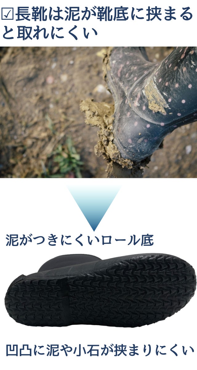 泥がつきにくいアウトソールは、凹凸に泥や小石が挟まりにくく、ザブザブ洗えてサッとお手入れができます。