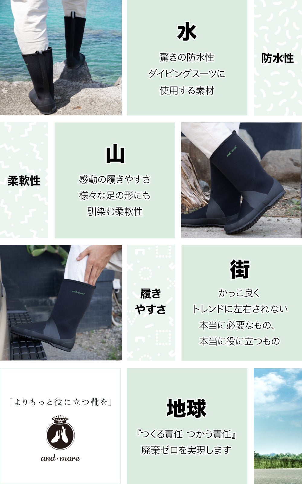 この経験からどんな悪天候の時でも対応できる靴を作りたいと思いました。長靴より機動力があって、楽に履けて安全に履ける防水ブーツを企画し誕生しました。