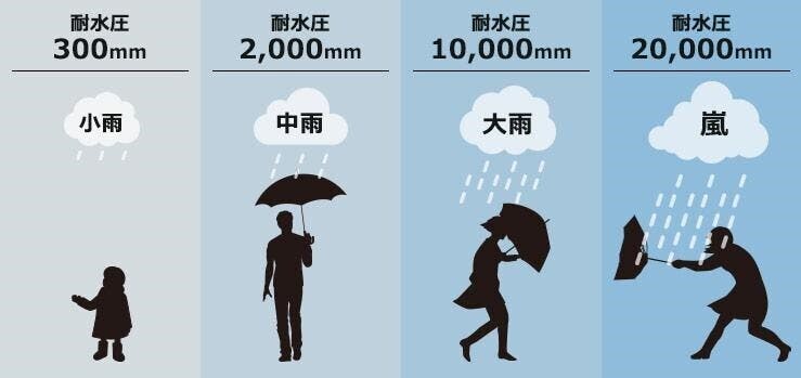 『耐水性』は布地にしみこむ水の力を抑える力の指標で、どれくらいの水の圧力に耐えられる防水性なのかを知ることが出来ます。一般的なナイロン製傘の耐水性は、250㎜程度
