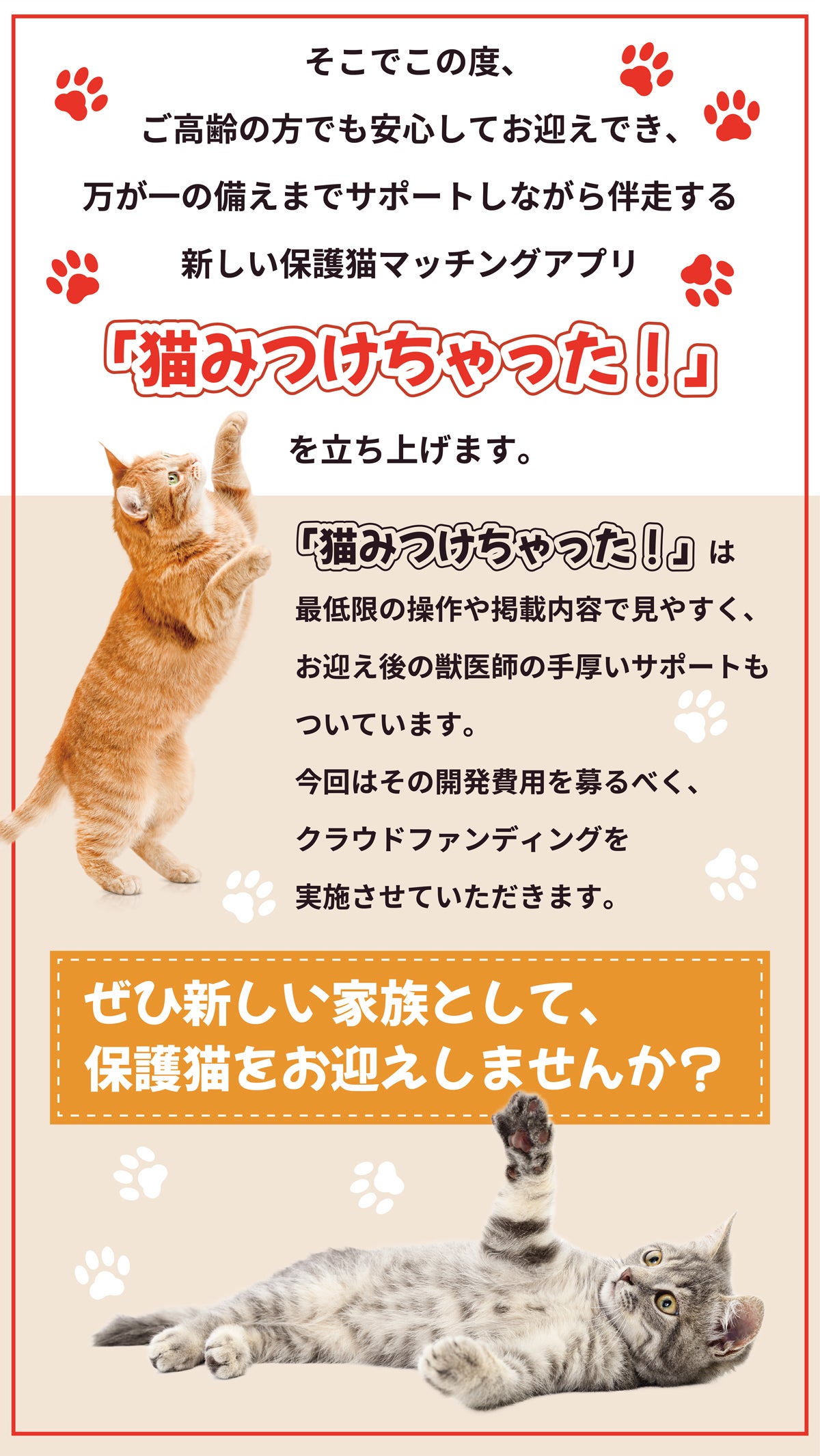 幅広い年齢層に対応し、獣医師によるサポートも充実した保護猫マッチングアプリ「猫みつけちゃった!」を作ります。