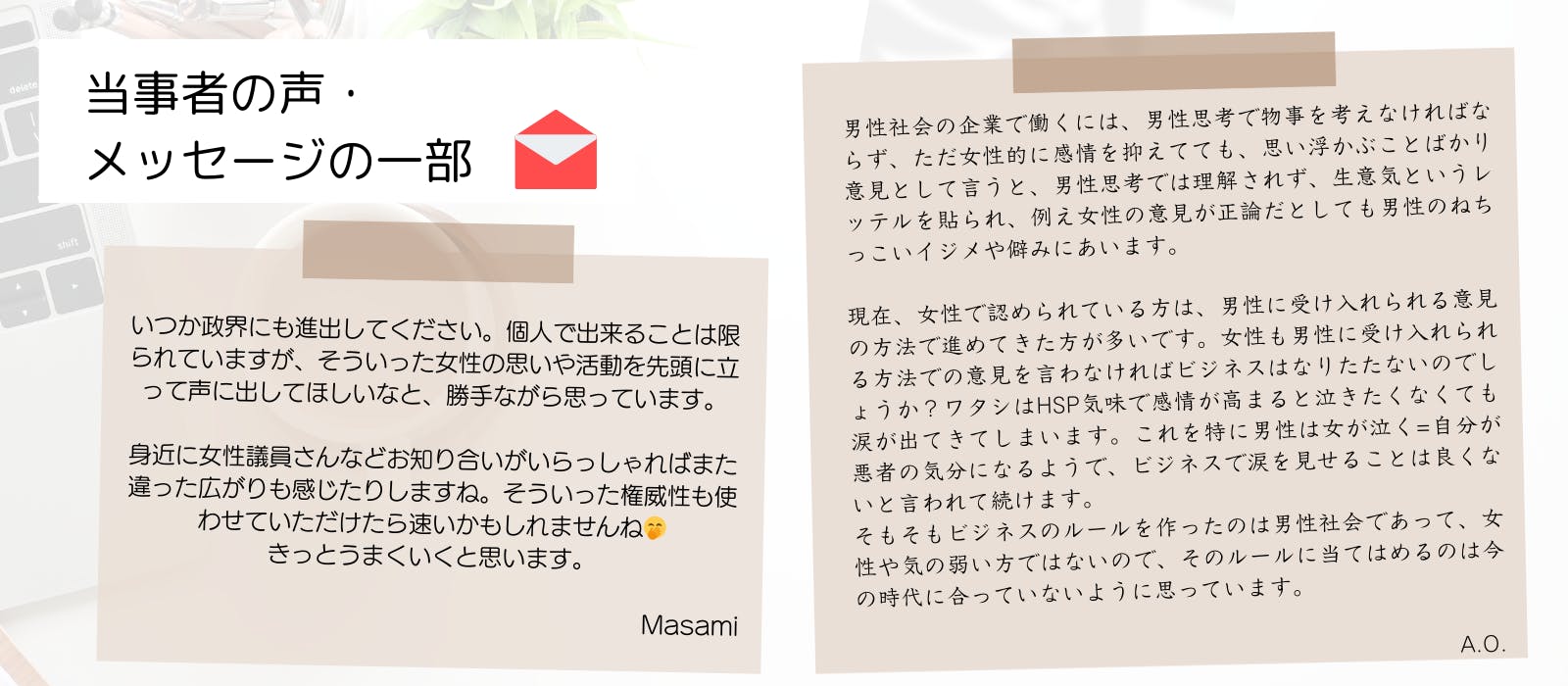 この苦しみがわかるのは当事者だけです。その当事者が声をあげない限り女性の苦しみなど無いことになっていきます。ですので、このクラファンでは、満を持して立ち上がった一般女性が社会を変える活動をはじめたことを多くの人に知って欲しいのです。