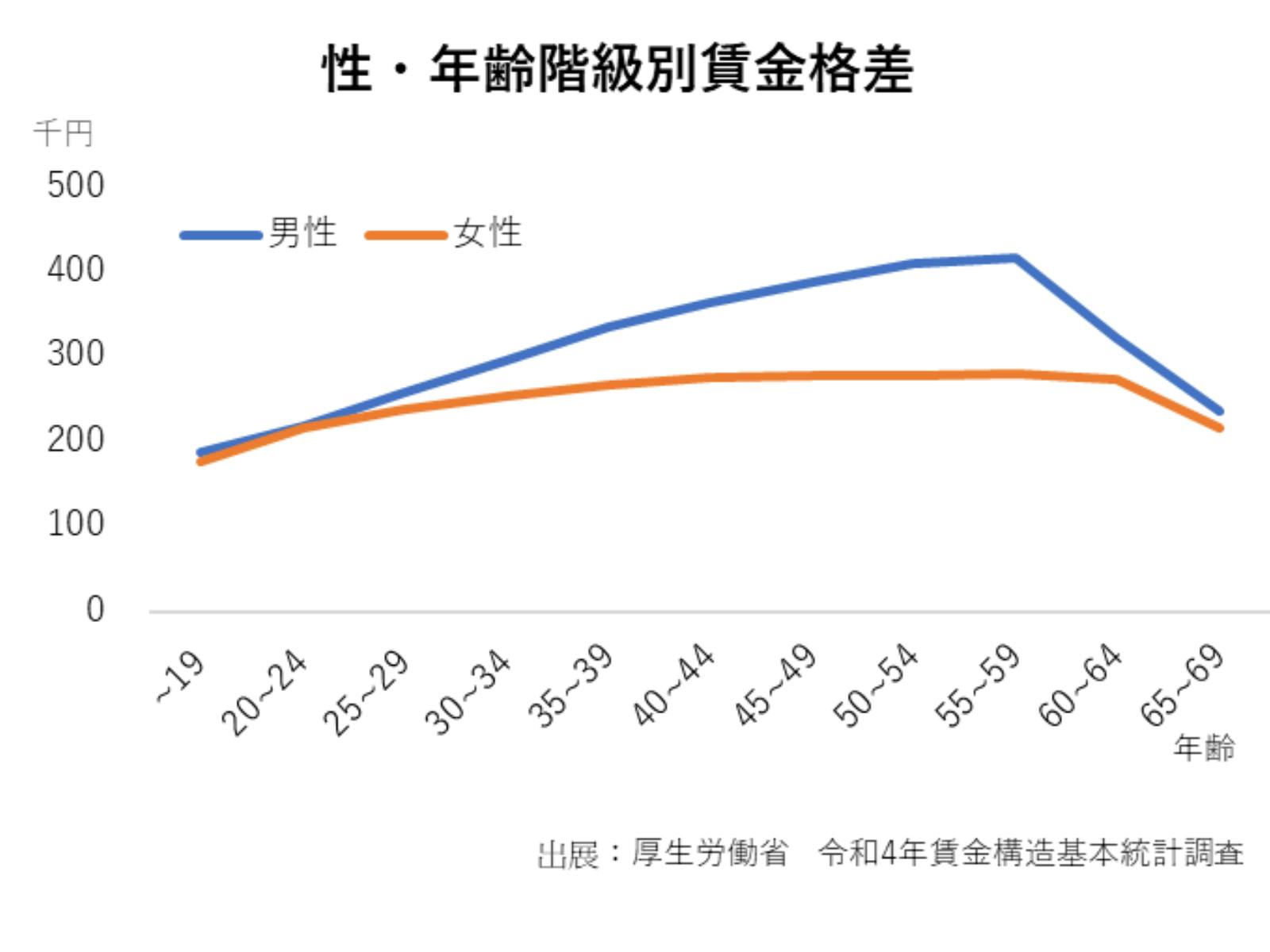 男性の賃金は50代に向かって上昇しますが、女性は何年働いても上がりません。
