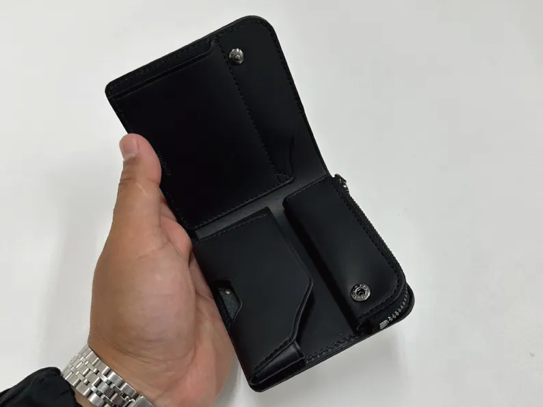 一見すると、見た目はデザイン性をそぎ落としシンプルとしか言いようがないシルエットの財布です。でも開いてみるとその何倍も魅力が詰まった中身の機能が本当に驚きの財布になります。