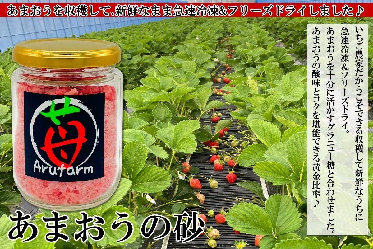 例えば、あまおうの砂とフリーズドライのお試しセットや、新鮮なままのあまおうを急速冷凍し、旬の美味しさをアイス感覚で食べることができる冷凍あまおう!