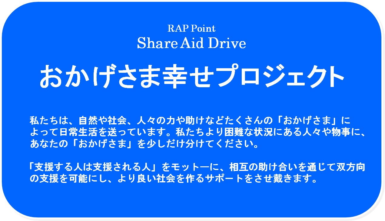 4.Share aid Driveおかげさま幸せプロジェクトのサイト内特設ページにお名前をか6月間掲載いたします。