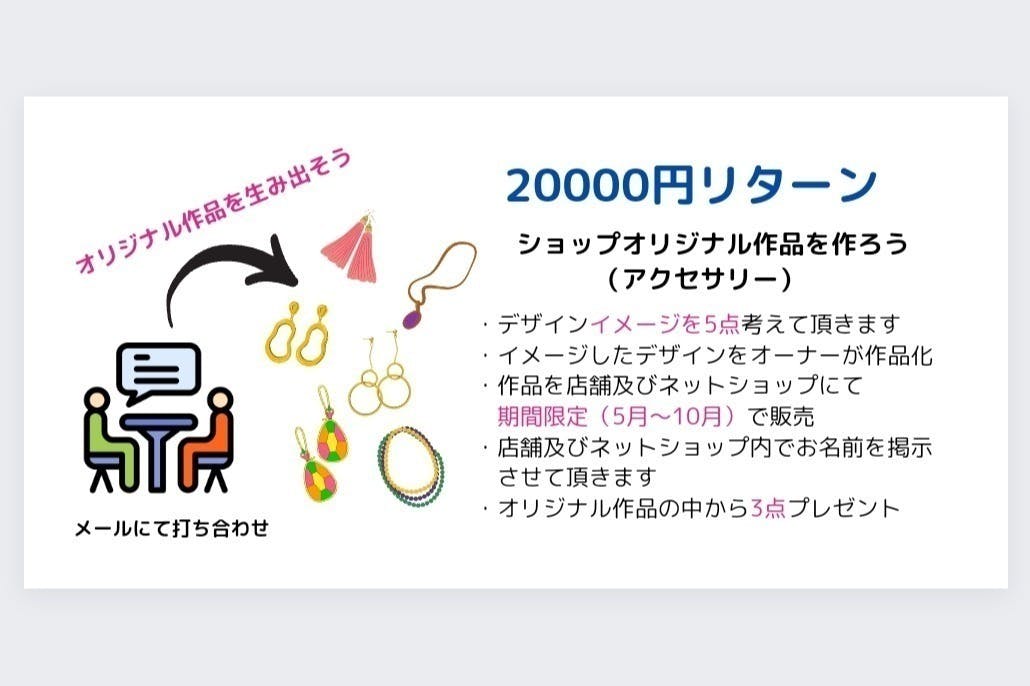 ショップのオリジナル作品考案製作(1点)+3カ月間の期間限定販売+作品提供